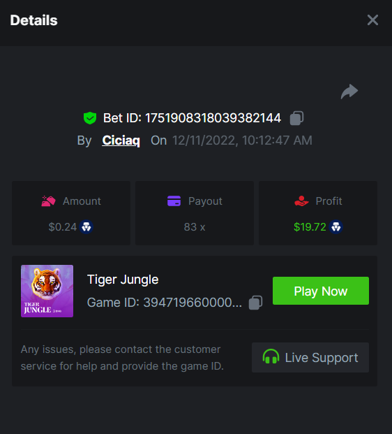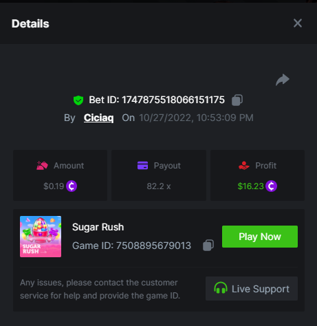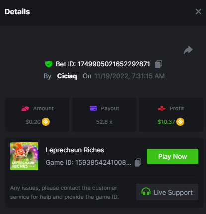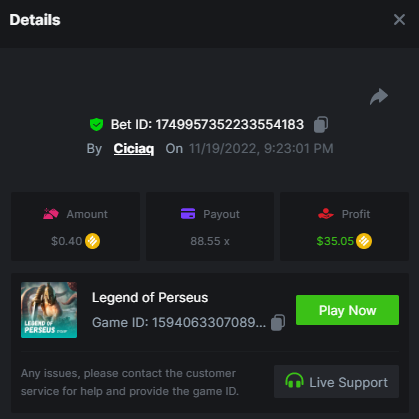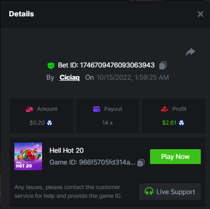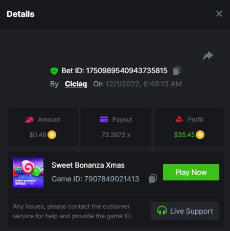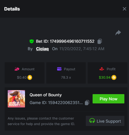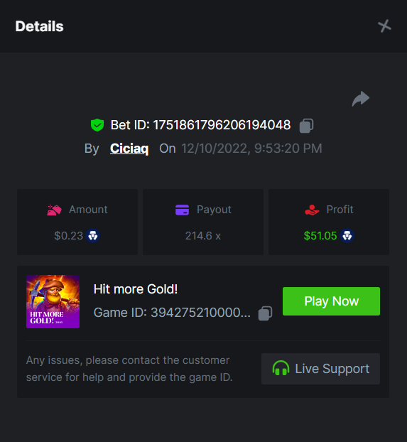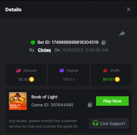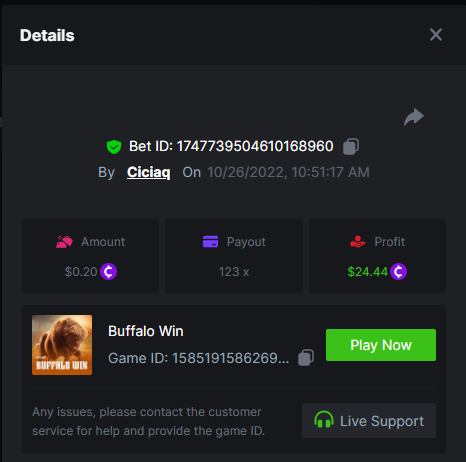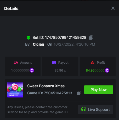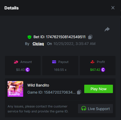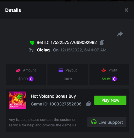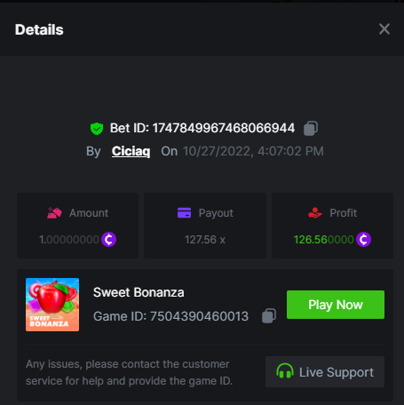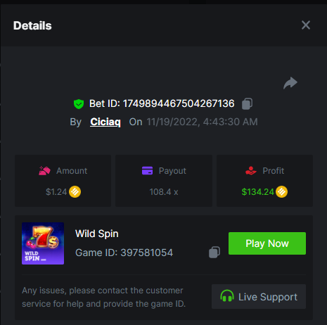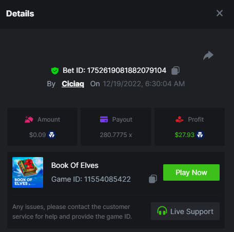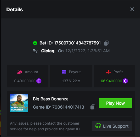 1. Book of Elves - 280.78x https://bc.game/#/sd/10ZK2Y591AUFWZ Book of Piggy Bank Riches - 537.5x https://bc.game/#/sd/10ZJC3O9P52J9V Wolf Fang - Golden Sands - 102.33x https://bc.game/#/sd/10ZEGDKTFN3J83 Athena's Glory - 135.67x https://bc.game/#/sd/10ZK8GPA2RAXAR Hut with Chicken Legs - 140x https://bc.game/#/sd/10ZC6PR7G57PQR Bounty: https://bc.game/#/sd/10ZDBH1IA77MZ7
