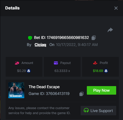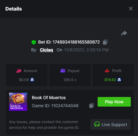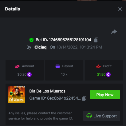 11. Book Of Muertos - 200.5x https://bc.game/#/sd/10WRANURH6N02B Fortuna de los Muertos II - 105.07x https://bc.game/#/sd/10WPRPZ7553TW3 Fortuna de los Muertos - 32.03x https://bc.game/#/sd/10WPYVPN9M54B7 Retro Muertos - 25.63x https://bc.game/#/sd/10WPL0Z9875FYR Book of Skulls - 101.59x https://bc.game/#/sd/10WPIWFN72UR6B Origins of Lilith - 108.72x https://bc.game/#/sd/10WPQDQWZSWETV