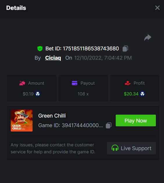 3. Green chilli - 108x https://bc.game/#/sd/10YZ2UY2QGK1ZN Tiger Jungle - 83x https://bc.game/#/sd/10Z0N3OC5Z776B Aztec fire - 144x https://bc.game/#/sd/10YWNJ7ZL4IMFN Happy fish - 448x https://bc.game/#/sd/10YWMIQUJ9VSIB Hit more gold! - 214.6x https://bc.game/#/sd/10YZDA4S5RXLHV