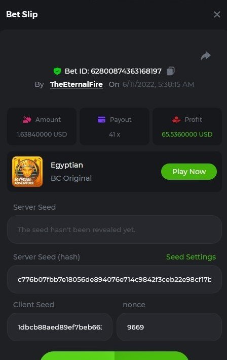 1. X83: Bet ID: 129193616991060246 https://bc.game/#/sd/116KJZBU600TUB ----- X130: Bet ID: 129444142433436075 https://bc.game/#/sd/116NAN0FM7WIS3 ---- X58: BET ID: 129619304084669553 https://bc.game/#/sd/116P9N5XJH32TV ---- X420 Bet ID: 129619304084671976 https://bc.game/#/sd/116PHFI0T492QB