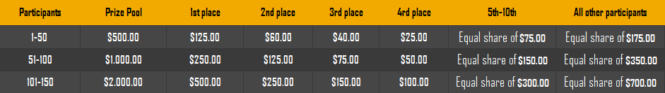 Congratulations to everyone involved! We had 74 players valid participations this time, check out more details of the ranking below. Top 74 Participants Ranking Username Prize 1st KG562 $500.00 2nd bassabar $300.00 3rd Mugen $200.00 4th Koroosh $100.00 5th Satoshimaker $50.00 6th Stefan99 $30.00 7th Nymphetamine $30.00 8th POLANA $30.00 9th badz $30.00 10th v1rtu0s $30.00 11th Monstrous Eberto $10.94 12th martwin $10.94 13th yllaeR $10.94 14th Cryptoliser $10.94 15th LemaK $10.94 16th kevinxde $10.94 17th NIRVANAUA $10.94 18th Juan28 $10.94 19th Chebster $10.94 20th basic_thedric $10.94 21st rasmus1234 $10.94 22nd RomaBeton $10.94 23rd Huypolyme $10.94 24th nica19 $10.94 25th xacutarafwb $10.94 26th Camz $10.94 27th LemmeWin $10.94 28th AngeL211 $10.94 29th dislan $10.94 30th Hoya_ $10.94 31st elean $10.94 32nd loading1699 $10.94 33rd Lixars $10.94 34th Beautiful_day $10.94 35th Coco17 $10.94 36th Elpresidente $10.94 37th Happyboy33 $10.94 38th Naughy11 $10.94 39th Shabby12 $10.94 40th Waterman $10.94 41st winit $10.94 42nd BCDQueen $10.94 43rd B0unty $10.94 44th Spritz $10.94 45th thiago18 $10.94 46th abolfazl75 $10.94 47th Cocor $10.94 48th DineroBit $10.94 49th GKD69 $10.94 50th HavABreak127 $10.94 51st KingBojji $10.94 52nd RORY $10.94 53rd Mun $10.94 54th jhonncueva $10.94 55th selena42 $10.94 56th amyra $10.94 57th Eve2807 $10.94 58th Player987 $10.94 59th Unlim $10.94 60th Wegotthis $10.94 61st drin27 $10.94 62nd epic $10.94 63rd Kristalina $10.94 64th OhMicrom $10.94 65th sleepmunaAKO $10.94 66th jlegend $10.94 67th Dyobchltbub $10.94 68th ForsakenFiliano $10.94 69th oMoRnInGsTaR12 $10.94 70th NoWins $10.94 71st _r_0_w3_n_4_ $10.94 72nd Jannine $10.94 73rd uno1989_suicide $10.94 74th MaksatMe $10.94 The prizes were sent to the Inbox of the selected ones. Don't forget to join our other weekly challenges, give it a try here.