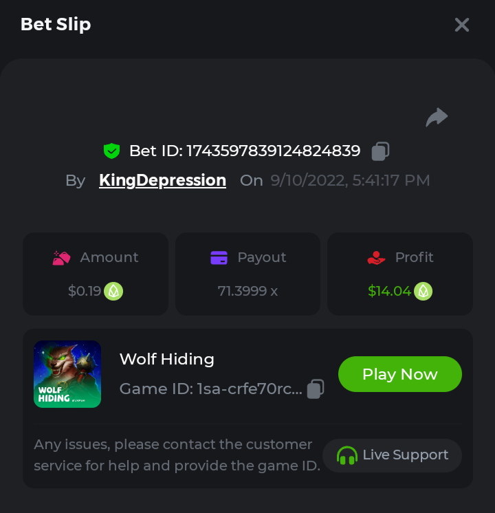 A millimeter off of the 500 free spins, got 5 instead. Hit 3 scatters on the first free spin but didn't give extra spins sadly. Total actual profit around $1. https://bc.game/#/sd/111UE52X1MAO7N -