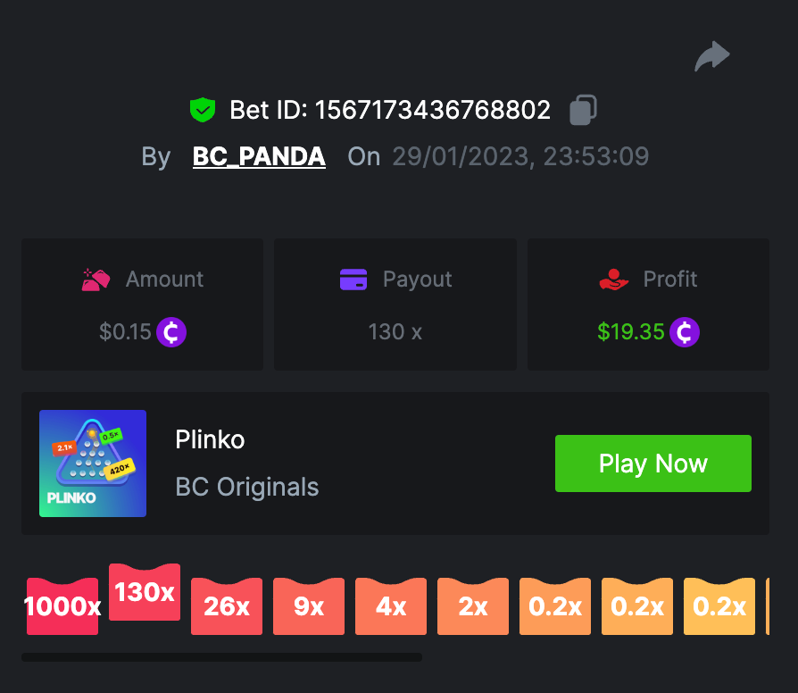 Prestige Plinko Challenge #66 DURATION: 30th JAN - 6th FEB 11:00 am UTC PRIZE POOL: $2,500 Hey, hey, VIPs! Look to the Sky, It's Raining METEORS, and they are closing in fast! Hit the highest number of unique payouts on Plinko to save yourself, and get your join in BCRocket to explore a new undiscovered planet. The Top 10 participants who hit the unique payouts on our selected in-house game will receive the major prize, in addition, each eligible entry will also get a share from the pool – check out below the rules. What's the Challenge? Complete as many of the following 17 payouts on Plinko. Must be an exact multiplier. | 11x | 13x | 22x | 29x | 33x | 37x | 43x | 58x | 76x | 88x | 110x | 120x | 170x | 260x | 420x | 620x | 1000x | Each payout you hit above counts as 1 point (Maximum 1 point for each payout). If there is a tie, the player with the higher average bet amount (in USD) shall be the winner. If there is a tie, the player with the higher average bet amount (in USD) shall be the winner. If there is a tie in the amount and payout, the one who posted or edited his post first will be considered in the Ranking. How to Enter To enter, copy the link of the bet you'd like to submit. Once you've copied it, paste it as a reply to this thread like so: Link: https://bc.game/#/sd/112F09EO4FE0PF In the same post, upload a screenshot of your win by clicking the game ID WITH VIEW IN USD mode ENABLED (accessible at the bottom of dropdown menu for your wallet up top. This way, we can ensure that your bet indeed met the minimum requirement at the time of placing it: LINK: https://bc.game/#/sd/112F09EO4FE0PF Minimum VIP There's no minimum VIP level Minimum Payouts Hit at least 3 payouts to qualify Minimum Bet Size $0.15 USD equivalent Eligible Coins All cryptocurrencies are eligible (excepting JB) Available Prizes Positions 1st 2nd 3rd 4th 5th 6th-10th All others Bounty Prizes $500 $300 $200 $100 $50 $30 $700 $500 EXTRA BOUNTY Share a winning bet with 420x multiplier or above and receive an equal share of the $500 prize pool! Original rules apply with all minimum requirements. GENERAL TERMS Please combine all of your hits together in a SINGLE post. Edit your existing post for additional hits, don't create a new post. Each eligible entry must have the Bet Slip URL, failure to include it will disqualify participation in the event. Bet Slip image is not mandatory. Bets must be posted within 24 hours of placing bet in order to keep things fair for everyone. Bets must be made during the specified time window stated above. This thread will lock automatically when the time period is over. One (1) entry per household. Anyone found attempting to win multiple prizes will be disqualified from this challenge as well as all future challenges. Failure to follow instructions will result in your submission being null and void. By entering this challenge, you acknowledge that BC.Game has the final decision on results and placement. Payouts will be distributed after the event is finished. Please note that it could take up to 72 hours after the completion of the event.