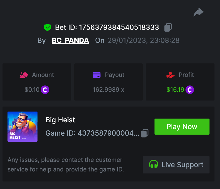 BOOONGO MID-WEEK MULTIPLIER BATTLE Duration: 30th JAN - 2nd FEB 09:00 am GMT Prize Pool: $1,500 Hello! Hello! to all our VIPs, It's Monday morning; A New week, a new day, and a new morning to start fresh and win new rewards! To end this first month of 2023 Booongo is here with their favourite mid-week multiplier battle with $1,500 worth of Prize Pool. We made changes to our prize pool distributions to reward the top 20 competitors with better rewards. Don't forget to keep reading below to find out all the terms and conditions of the event. Good luck to you all! Eligible Games: Play below games to participate in this event: The highest multiplier reached in each game will be added together and counted as total points. Bonus buys are allowed. If the player submits multiple winning entries for the same game, the entry with the highest multiplier will be valid. How to Enter Access the game to select your Bet ID, click on the Share icon (↷) and then Copy link. Return to the topic, paste the link in the field "Reply to this topic..." E.g.: https://bc.game/#/sd/112EXIXAJWLATV In the same post, upload a screenshot of your win by clicking the game ID WITH VIEW IN USD mode ENABLED (accessible at the bottom of dropdown menu for your wallet up top, and Submit Reply. Done! This way, we can ensure that your bet indeed met the minimum requirement at the time of placing it: https://bc.game/#/sd/112EXIXAJWLATV Minimum VIP Tier Must be VIP04 or higher in order to enter this event. Minimum Payout Minimum payout to qualify is 15x (in any game) for a valid entry. Minimum Bet Size Goddess of Egypt - $0.20 Happy Fish - $0.20 Sticky Piggy - $0.20 Big Heist - $0.10 Candy Boom - $0.20 Eligible Coins All cryptocurrencies are eligible (excepting JB, and BCL). Free Play Mode is not valid for this event. Prize Pool & Reward Breakdown The winners will win a share of the prize pool based on the detailed ranking below. Participants Prize Pool 1st place 2nd place 3rd place 4th place 5-10th 10-20th 1-100 $750 $300 $150 $75 $40 Equal share of $90 Equal share of $95 100+ $1,500 $600 $300 $150 $75 Equal share of $185 Equal share of $190 Additional Rules: Please combine all of your hits together in a SINGLE post. Edit your existing post for additional hits, don't create a new post. Each eligible entry must have the Bet Slip URL, failure to include it will disqualify participation in the event. Bet Slip image is not mandatory. Bets must be posted within 24 hours of placing bet in order to keep things fair for everyone. Bets must be made during the specified time window stated above. This thread will lock automatically when the time period is over. One (1) entry per household. Anyone found attempting to win multiple prizes will be disqualified from this challenge as well as all future challenges. Failure to follow instructions will result in your submission being null and void. By entering this challenge, you acknowledge that BC.Game has the final decision on results and placement. Payouts will be distributed after the event is finished. Please note that it could take up to 72 hours after the completion of the event.