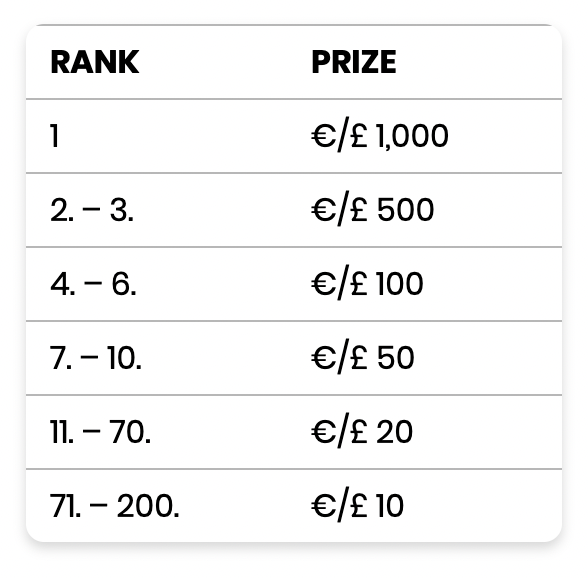 ROUND 1: 1st FEB, 00:00 UTC - 5th FEB, 23:59 UTC ROUND 2: 6th FEB, 00:00 UTC - 12th FEB, 23:59 UTC TOTAL PRIZE POOL: $80,000 Hello to all the VIPs! An exciting sports leaderboard event with a total prize pool of $80,000 live now. This event will have 2 rounds with $40,000 pool in each rounds. The leaderboard will be available on Sports page as a widget to check the progress live. You can place bets on any of the mentioned sports to participate in the event (FIFA, NBA 2K, eCricket, Rocket League, eFighting, eShooter, eTennis, eBaseball). Prizes will be distributed as Free Bets (info: how to use free bets) Read the complete terms and conditions below to know more: How to Participate: Place any pre-match or live bet on any match offered in sections FIFA, NBA 2K, eCricket, Rocket League, eFighting, eShooter, eTennis, eBaseball. Minimum bet required to take part in the tournament is $1 or player’s currency equivalent. Minimum number of weekly bets in order the player to be allocated within the prize pool section is 5. Minimum odds: 1.5 How to win: Each leaderboard is calculated by adding points that the player receives for each won bet. Points for the won bets are calculated based on real winnings amount. Points = win - stake. Example: $10 win with $2 stake gives 8 points to a player. On top of that, every single bet (won or lost) gives 1 extra point. Tournament schedule and prize pool: Round 1: 1st FEB, 00:00 UTC - 5th FEB, 23:59 UTC - $40,000 Round 2: 6th FEB, 00:00 UTC - 12th FEB, 23:59 UTC - $40,000 PLACE PRIZE (per user) TOTAL 1 $5,000.00 $5,000.00 2 $3,500.00 $3,500.00 3 $2,500.00 $2,500.00 4 $1,700.00 $1,700.00 5 $1,500.00 $1,500.00 6 $1,000.00 $1,000.00 7 $900.00 $900.00 8 $750.00 $750.00 9 $500.00 $500.00 10 - 12 $300.00 $900.00 13 - 15 $250.00 $750.00 16 - 20 $200.00 $1,000.00 21 - 29 $200.00 $1,800.00 30 - 35 $150.00 $900.00 36 - 100 $100.00 $6,500.00 101 - 190 $75.00 $6,750.00 191 - 251 $50.00 $3,050.00 252 - 300 $20.00 $1,000.00 General Terms Tournament includes 2 weekly tournaments each consisting of $40,000 prize pool. Total prize pool in this campaign is $80,000, which is distributed as Free Bets. (info: how to use free bets) Minimum bet required to take part in the tournament is $1 or player’s currency equivalent. In the case of a tied score, the player achieving the score first will get the prize associated with the position. Each player can win one prize during each tournament. Only won bets with minimum odds of 1.5 within the time frame of the Betby.Games Tournament can participate. Cancelled, refunded, cashed out bets and bets that have been settled after the all tournaments have ended are not participating in the tournament and are not subjected to any prizes. Players need at least 5 bets per week, which meet the tournament requirements in order to be allocated within the prize pool section. Each leaderboard is calculated by adding points that the player receives for his betting activity. Points for the won bets are calculated based on real winnings amount. Points = win - stake. Example: $10 win with $2 stake gives 8 points to a player. Points calculation is based on EUR rate Only 1 account per household will be eligible to take part in this event. The bet participating in the campaign has to be placed with players' own funds. Bets that are placed using free bets are not participating in the tournaments. All prizes are paid out by the end of each tournament within 48 hours. Player that doesn't want to participate in the tournament should notify support so that his points can be discredited and he won't be subjected to any tournament prizes. BC.GAME holds the right to cancel the tournament for the indefinite term without any payments according to leaderboards in cases of emergency and reserves the right to make amendments to Terms and Conditions or cancel the promotion at any time.