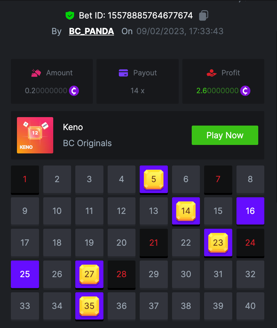 $1.5k Prestige Weekend Keno Challenge #68 DURATION: 10th FEB - 13th FEB 09:00 am UTC Greetings VIPs! Ending this week with another most loved game KENO! As to the new version of our prestige challenges this weekend we are excited to host the Keno and Keno Multiplayer challenge with prize pool of $1,500, duration of this challenge will be from 10th FEB - 13th FEB 09:00 UTC. Don't forget to read all terms below to find out how to participate in this event. Good Luck! What's the Challenge? Complete as many of the following 20 payouts on either KENO or KENO Multiplayer. Must be a exact multiplier. | 5.10x | 11x | 17x | 26x | 30x | 56x | 63x | 81.5x | 100x | 180x | 250x | 270x | 350x | 450x | 500x | 600x | 710x | 800x | 900x | 1000x Each payout you hit above counts as 1 point (Maximum 1 point for each payout). If there is a tie, the player with the higher average bet amount (in USD) shall be the winner. How to Enter To enter, copy the link of the bet you'd like to submit. Once you've copied it, paste it as a reply to this thread like so: Link: https://bc.game/#/sd/1135M13OA5PPG3 In the same post, upload a screenshot of your win by clicking the game ID WITH VIEW IN USD mode ENABLED (accessible at the bottom of dropdown menu for your wallet up top. This way, we can ensure that your bet indeed met the minimum requirement at the time of placing it: Link: https://bc.game/#/sd/1135M13OA5PPG3 Minimum Payouts Hit at least 3 payouts to qualify Minimum Bet Size $0.20 USD equivalent Eligible Coins All cryptocurrencies are eligible (excepting JB, and BCL) Available Prizes Positions 1st 2nd 3rd 4th 5th 6th-10th 11th-20th Bounty Prizes $500 $250 $125 $75 $50 $125 $125 $250 EXTRA BOUNTY Go an extra mile and get a share of this Bounty! To be a part of Bounty win 500x multiplier with $0.20 bet! Original rules apply with all minimum requirements. GENERAL TERMS There is no minimum level to participate in this event everyone is welcome to join. Minimum bet is $0.20 Please combine all of your hits together in a SINGLE post. Edit your existing post for additional hits, don't create a new post. Bets must be posted within 24 hours of placing bet in order to keep things fair for everyone. Bets must be made during the specified time window stated above. This thread will lock automatically when the time period is over. One (1) entry per household. Anyone found attempting to win multiple prizes will be disqualified from this challenge as well as all future challenges. Failure to follow instructions will result in your submission being null and void. By entering this challenge, you acknowledge that BC.Game has the final decision on results and placement. Payouts will be distributed after the event is finished. Please note that it could take up to 4 days after the completion of the event.