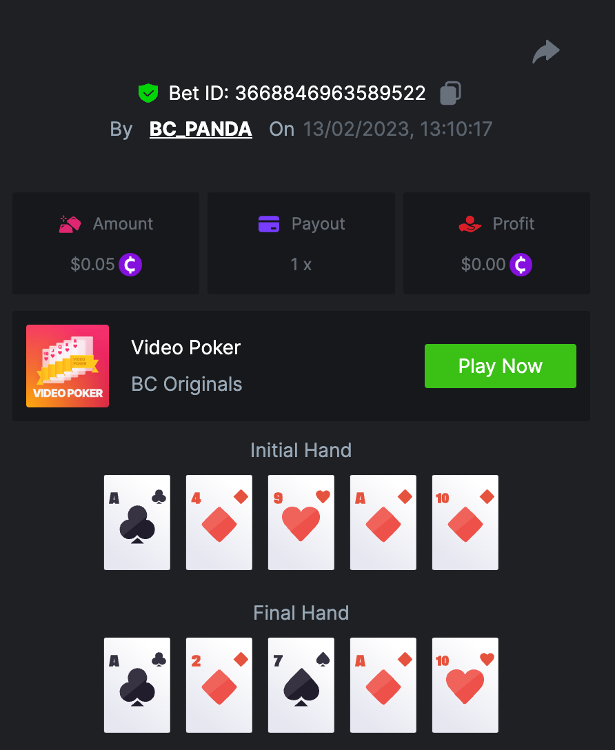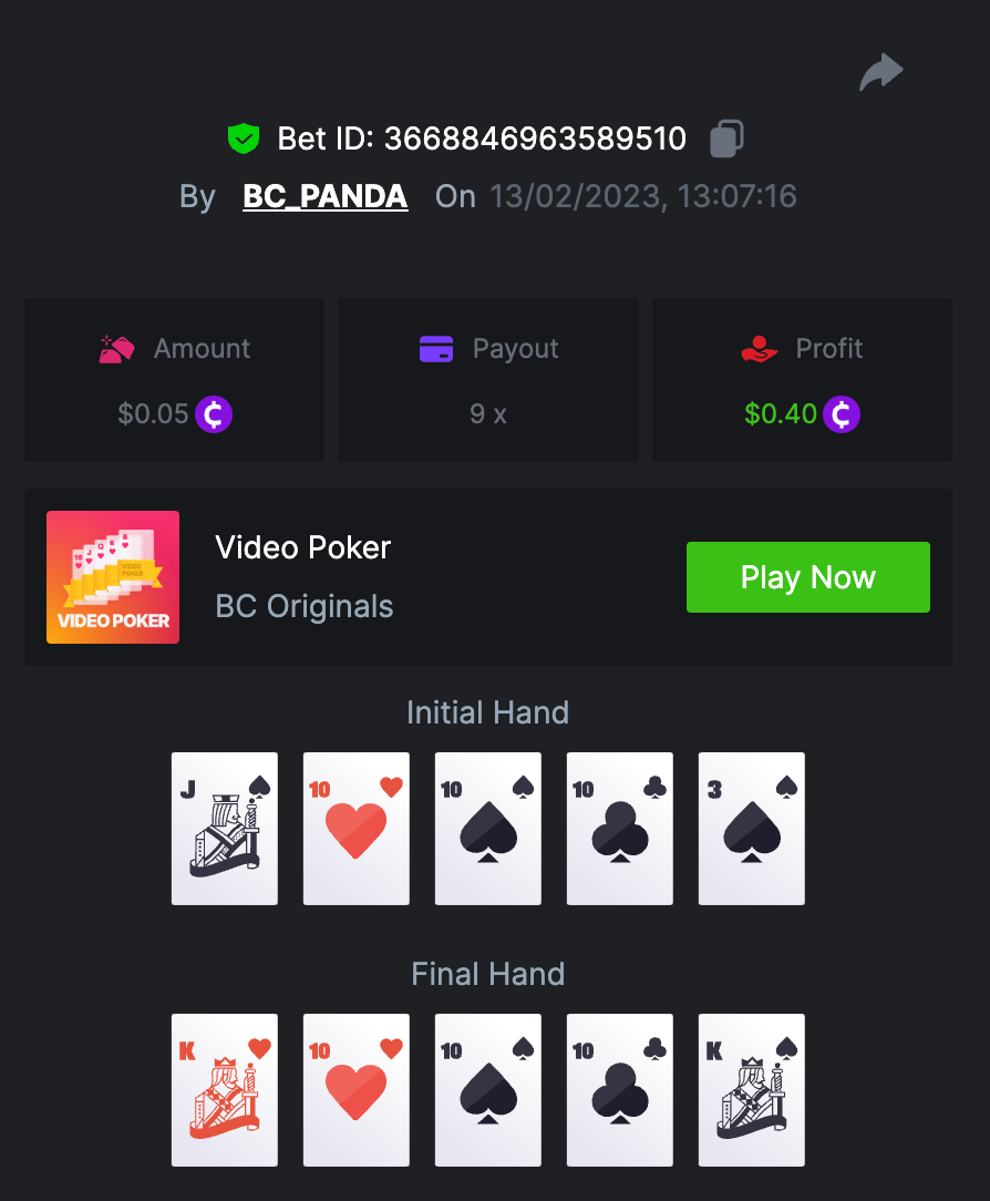 $1.5k Prestige Mid-week Video Poker Challenge #69 DURATION: 13th FEB - 16th FEB 09:00 am UTC Kicking off another week with the most awaited Video Poker Prestige Challenge! The total prize pool of this challenge is $1,500 with duration from 13th Feb till 16th Feb. Get the most consecutive wins at Video Poker and challenge yourself to hit the highest points possible (more details below). What's the Challenge? Win as many hands as possible in a row without losing at Video Poker, the points will be based on each payout reached in consecutive wins. For example: If the participant wins the Full House hand and then Jacks or Better, the point total will be 10. In case of loss, counting must start again. If there is a tie, the player with the higher average bet amount (in USD) shall be the winner. If there is a tie in the amount and payout, the one who posted or edited his post first will be considered in the Ranking. How to Enter To enter, copy the link of the bet you'd like to submit. Once you've copied it, paste it as a reply to this thread like so: Bet Link: https://bc.game/#/sd/113F2GB47U1FDF In the same post, upload a screenshot of your win by clicking the game ID WITH VIEW IN USD mode ENABLED (accessible at the bottom of dropdown menu for your wallet up top. This way, we can ensure that your bet indeed met the minimum requirement at the time of placing it: Total Points: 10 Minimum VIP There's no minimum VIP level Minimum Bet Size $0.05 USD equivalent Eligible Coins All coins are eligible (excepting JB) Available Prizes Positions 1st 2nd 3rd 4th 5th 6th-10th 11th-20th Bounty Prizes $500 $250 $125 $75 $50 $125 $125 $250 EXTRA BOUNTY Go an extra mile and get a share of this Bounty! To be a part of Bounty, win Royal Flush with $0.10 or above bet! Original rules apply with all minimum requirements. GENERAL TERMS Please combine all of your hits together in a SINGLE post. Edit your existing post for additional hits, don't create a new post. Bets must be posted within 24 hours of placing bet in order to keep things fair for everyone. Bets must be made during the specified time window stated above. This thread will lock automatically when the time period is over. One (1) entry per household. Anyone found attempting to win multiple prizes will be disqualified from this challenge as well as all future challenges. Failure to follow instructions will result in your submission being null and void. By entering this challenge, you acknowledge that BC.Game has the final decision on results and placement. Payouts will be distributed after the event is finished. Please note that it could take up to 4 days after the completion of the event.