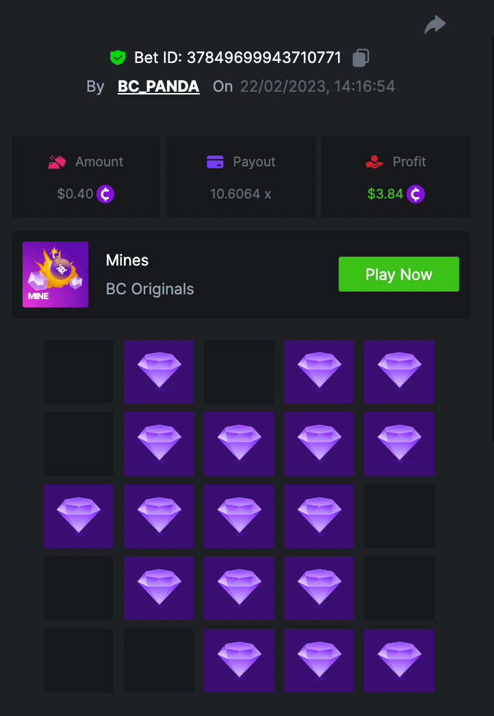 $1.5k Prestige Mines Challenge #72 DURATION: 23rd FEB - 27th FEB 09:00 am UTC Welcome back, VIP's, this week, you are going to face the Prestige Challenge with your Mines. Total prize pool of $1,500 will be distributed between 20 top challengers plus $250 worth of bounties included for anyone getting 15 mines - 5 diamonds (208.73x). Read more details below: What's the Challenge? Win the highest multiplier you can on on BC.Game's in-house game, Mines. If there is a tie, the player with the higher average bet amount (in USD) shall be the winner. If there is a tie in the amount and payout, the one who posted or edited his post first will be considered in the Ranking How to Enter To enter, copy the link of the bet you'd like to submit. Once you've copied it, paste it as a reply to this thread like so: Link: https://bc.game/#/sd/1141O4366WCE1F In the same post, upload a screenshot of your win by clicking the game ID WITH VIEW IN USD mode ENABLED (accessible at the bottom of dropdown menu for your wallet up top. This way, we can ensure that your bet indeed met the minimum requirement at the time of placing it: Link: https://bc.game/#/sd/1141O4366WCE1F Minimum VIP There's no minimum VIP level Minimum Payouts Minimum payout to qualify is 10x Minimum Bet Size $0.30 USD equivalent Eligible Coins All cryptocurrencies are eligible (excepting JB) Available Prizes Positions 1st 2nd 3rd 4th 5th 6th-10th 11th-20th Bounty Prizes $500 $250 $125 $75 $50 $125 $125 $250 EXTRA BOUNTY Share a winning bet with 15 mines - 5 diamonds (208.73x) and receive an equal share of the $250 prize pool! Original rules apply with min bet, minimum VIP. GENERAL TERMS Please combine all of your hits together in a SINGLE post. Edit your existing post for additional hits, don't create a new post. Each eligible entry must have the Bet Slip URL, failure to include it will disqualify participation in the event. Bet Slip image is not mandatory. Bets must be posted within 24 hours of placing bet in order to keep things fair for everyone. Bets must be made during the specified time window stated above. This thread will lock automatically when the time period is over. One (1) entry per household. Anyone found attempting to win multiple prizes will be disqualified from this challenge as well as all future challenges. Failure to follow instructions will result in your submission being null and void. By entering this challenge, you acknowledge that BC.Game has the final decision on results and placement. Payouts will be distributed after the event is finished. Please note that it could take up to 4 days after the completion of the event.