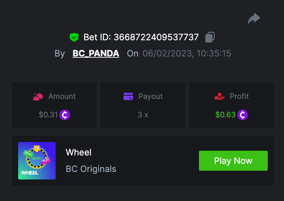 Mid-week Wheel Prestige Challenge #67 DURATION: 6th FEB - 9th FEB 11:00 am UTC PRIZE POOL: $1,500 Hello dear VIPs! Prestige challenge is back with another twist and different approach! We have split our Prestige challenges to 2 different challenges for that extra sweetness, Mid-week and weekend Prestige challenges. To make it more interesting for you all we have also changed the prize pool distributions to make your rewards worth it. Don't forget to keep reading below to find out all the new changes and we wish you good luck! What's the Challenge? Participants must win as many consecutive bets as possible by hitting the colour Orange or Purple (On in-house Wheel game). Consecutive bets must be of the same colour to validate the entry. Any selected Risk and Segment are valid which has these colours. Rank will be determined by the largest amount of consecutive bets, the longest sequence will be in 1st place and successively. In the event of a tie, the advantage will be given to the highest average bet in dollars. In the event of a tie again, the first bet placed will have the advantage. How to Enter To enter, copy the link of the bet you'd like to submit. Once you've copied it, paste it as a reply to this thread like so: Link: https://bc.game/#/sd/112XGQXSUWXGK3 In the same post, upload a screenshot of your win by clicking the game ID WITH VIEW IN USD mode ENABLED (accessible at the bottom of dropdown menu for your wallet up top. This way, we can ensure that your bet indeed met the minimum requirement at the time of placing it: Link: https://bc.game/#/sd/112XGQXSUWXGK3 Minimum VIP Tier Must be VIP04 or higher in order to enter this challenge. Minimum Bets Win at least 3 consecutive bets to qualify, hitting one of the 2 colours mentioned above (Consecutive wins must be the same colour). Minimum Bet Size $0.30 USD equivalent Eligible Coins All cryptocurrencies are eligible (excepting JB) Available Prizes Positions 1st 2nd 3rd 4th 5th 6th-10th 11th-20th Bounty Prizes $500 $250 $125 $75 $50 $125 $125 $250 EXTRA BOUNTY Go an extra mile and get a share of this Bounty! To be a part of Bounty win 2 consecutive bets with 49.5x! Original rules apply with all minimum requirements. GENERAL TERMS Please combine all of your hits together in a SINGLE post. Edit your existing post for additional hits, don't create a new post. Bets must be posted within 24 hours of placing bet in order to keep things fair for everyone. Bets must be made during the specified time window stated above. This thread will lock automatically when the time period is over. One (1) entry per household. Anyone found attempting to win multiple prizes will be disqualified from this challenge as well as all future challenges. Failure to follow instructions will result in your submission being null and void. By entering this challenge, you acknowledge that BC.Game has the final decision on results and placement. Payouts will be distributed after the event is finished. Please note that it could take up to 72 hours after the completion of the event.
