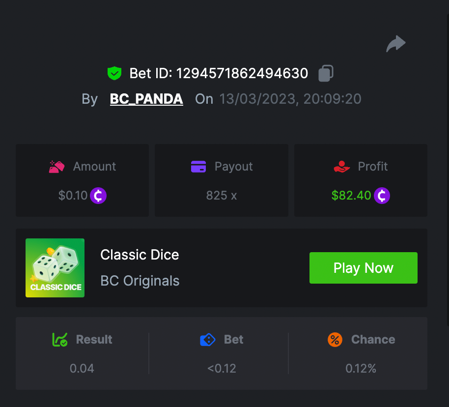 $1.5k Prestige Classic Dice Challenge #77 DURATION: 13th MAR - 16th MAR 14:30 pm UTC Welcome players, it's time to take chances! The challenge is the Classic Dice and participants will need to reach 25 exact target payouts, and all of them together will be summed up as 1 point (maximum 16 points). The Prize pool is $1,500 of which $250 will be reserved for the extra bonus. Get ready! Life is a gamble and you never know what comes next, so roll the dice! What's the Challenge? Complete as many of the following 25 payouts on our in-house Classic Dice. Must be a winning bet. | 5x | 15x | 25x | 33x | 44x | 55x | 66x | 75x | 90x | 99x | 100x | 150x | 180x | 220x | 300x | 330x | 396x | 450x | 550x | 825x | 900x | 1100x | 2475x | 3300x | 4950x | Each payout you hit above counts as 1 point (Maximum 1 point for each payout). If there is a tie, the player with the higher average bet amount (in USD) shall be the winner. How to Enter To enter, copy the link of the bet you'd like to submit. Once you've copied it, paste it as a reply to this thread like so: Link: https://bc.game/#/sd/115D681CL3YT5F In the same post, upload a screenshot of your win by clicking the game ID WITH VIEW IN USD mode ENABLED (accessible at the bottom of dropdown menu for your wallet up top. This way, we can ensure that your bet indeed met the minimum requirement at the time of placing it: Link: https://bc.game/#/sd/115D681CL3YT5F Minimum VIP There's no minimum VIP level Eligibility to Win Prize Win at least 3 payouts to qualify. Minimum Bet Size $0.10 USD equivalent Eligible Coins All cryptocurrencies are eligible (excepting JB) Available Prizes Positions 1st 2nd 3rd 4th 5th 6th-10th 11th-20th Bounty Prizes $500 $250 $125 $75 $50 $125 $125 $250 EXTRA BOUNTY Post a winning bet with 825x multiplier or more and receive an equal share of the $250 prize pool! Original rules apply with all minimum requirements. GENERAL TERMS Please combine all of your hits together in a SINGLE post. Edit your existing post for additional hits, don't create a new post. Each eligible entry must have the Bet Slip URL, failure to include it will disqualify participation in the event. Bet Slip image is not mandatory. Bets must be posted within 24 hours of placing bet in order to keep things fair for everyone. Bets must be made during the specified time window stated above. This thread will lock automatically when the time period is over. One (1) entry per household. Anyone found attempting to win multiple prizes will be disqualified from this challenge as well as all future challenges. Failure to follow instructions will result in your submission being null and void. By entering this challenge, you acknowledge that BC.Game has the final decision on results and placement. Payouts will be distributed after the event is finished. Please note that it could take anywhere between 24 hours to 7 days after the completion of the event.