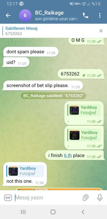 1. I won the "100x sword 10 winner 3bcd" event organized by @BC_Raikage by submitting my bet ID as 6th. @BC_Raikage congratulated me on completing it. and then forgot to add my id to the list. Even though I warned him, he did not add it and the event, which lasted another 20 minutes, was finally concluded. Even though I told him that my ID number was still not on the list, he did not add it and blocked me from Telegram and Global Chat to suppress his own mistake.. my bet id : https://bc.game/#/sd/122DWZ7OOJBA5J and i send my bet id chat same time you can check photos. And he immediately congratulated me....... I am adding this as a photo......