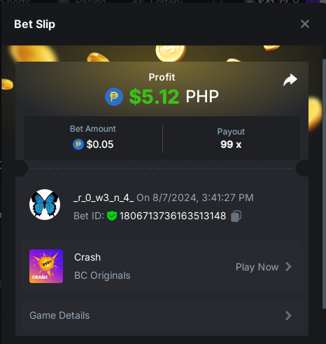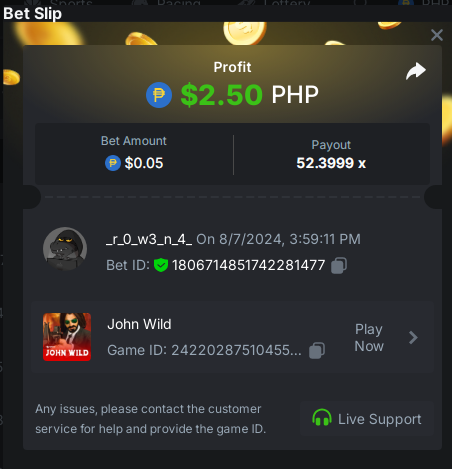1. Crash x99 .05 https://hash.game/#/sd/124NMZ6TN1T0CR JOHNWILD x50 https://hash.game/#/sd/124NO3APWVOK23 Buy at least 25 lottery tickets and place a bet on the lottery SPORTBET 1.5x ODDS 1USD BET TICKET ID: 2432895037160431791 DEPOSIT 20USD WAGER 2000USD