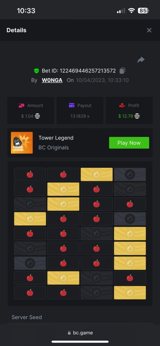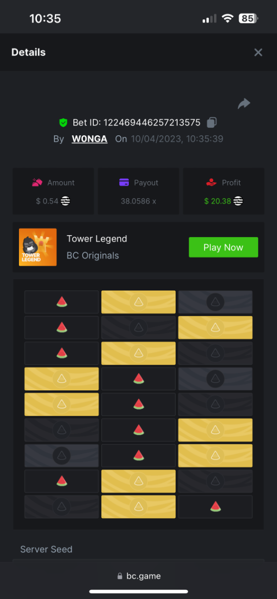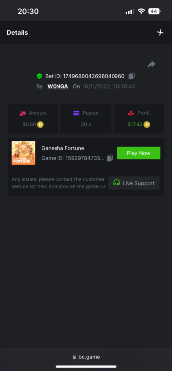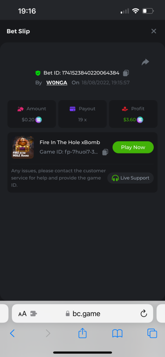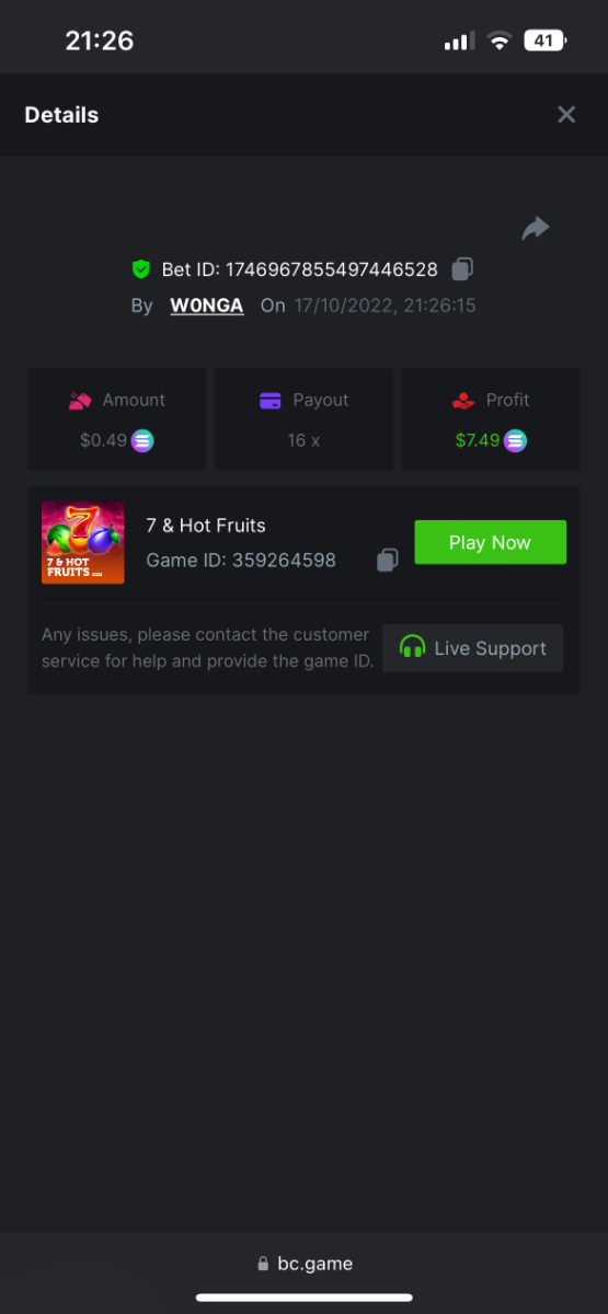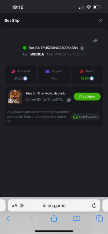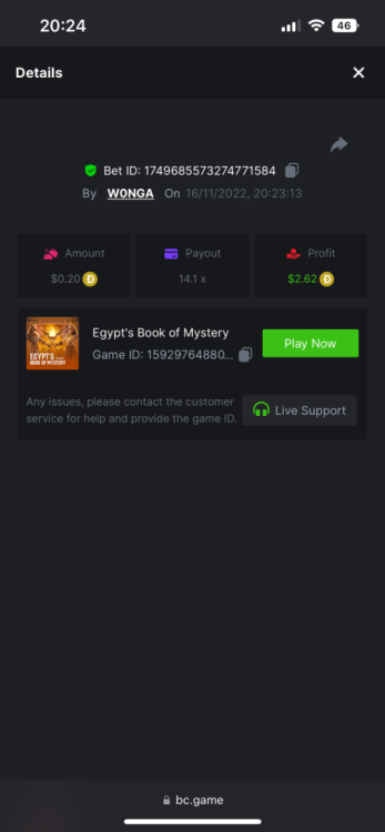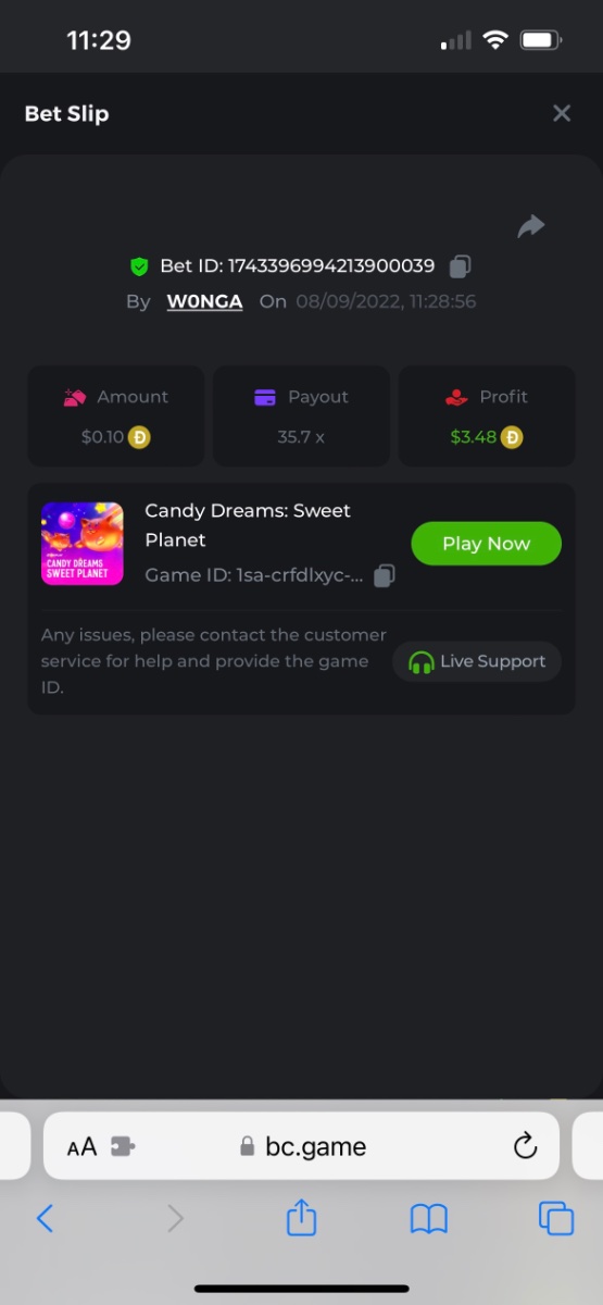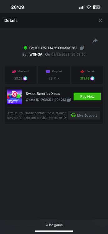 https://bc.game/#/sd/10YFF23M9VN76B This was a clean 50x win on $0.10! But the the dollar conversion says different. https://bcgame-dk2.pragmaticplay.net/gs2c/lastGameHistory.do?symbol=vs10bbbonanza&mgckey=AUTHTOKEN@11cc628b718a1c586678b11736e84ea3dfa730c7917478308de6e25bef028d13~stylename@bcgame_bcgame~SESSION@23942c19-4f81-4335-ac9a-6cefff7f9a75~SN@192ffaf4&tz=-00%3A00&mgckey=AUTHTOKEN@11cc628b718a1c586678b11736e84ea3dfa730c7917478308de6e25bef028d13~stylename@bcgame_bcgame~SESSION@23942c19-4f81-4335-ac9a-6cefff7f9a75~SN@192ffaf4 https://bc.game/#/sd/10YFG753VMQS5V https://bc.game/#/sd/10YFGJAIT2RMS3 https://bc.game/#/sd/10YFGXMC5YV8K3 https://bc.game/#/sd/10YGZ4VK6RWOIB -