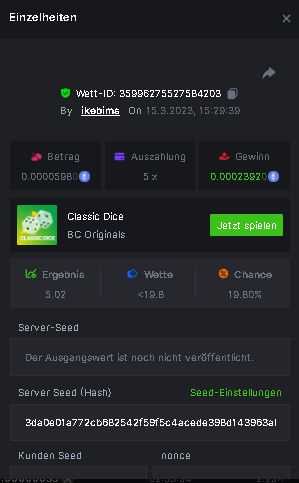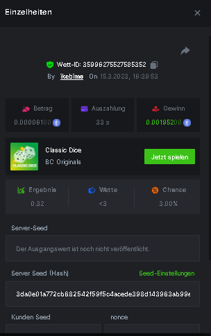 Username : chompik Bet-ID : 2599627740169779 Amount : 3.2 TRX (0.10$) Result : 0 --------------------------------------------------------- Bet-ID : 2599627740171432 Amount : 0.00004545 BTC (1.05$) Result : 12.25 -------------------------------------------------------- Bet-ID : 2599627740172381 Amount : 0.00003896 BTC (0.90$) Result : 0