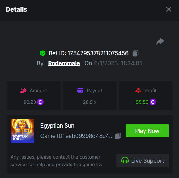 5. Egyptian Sun https://bc.game/#/sd/110TXIOH4MV66R x28.8