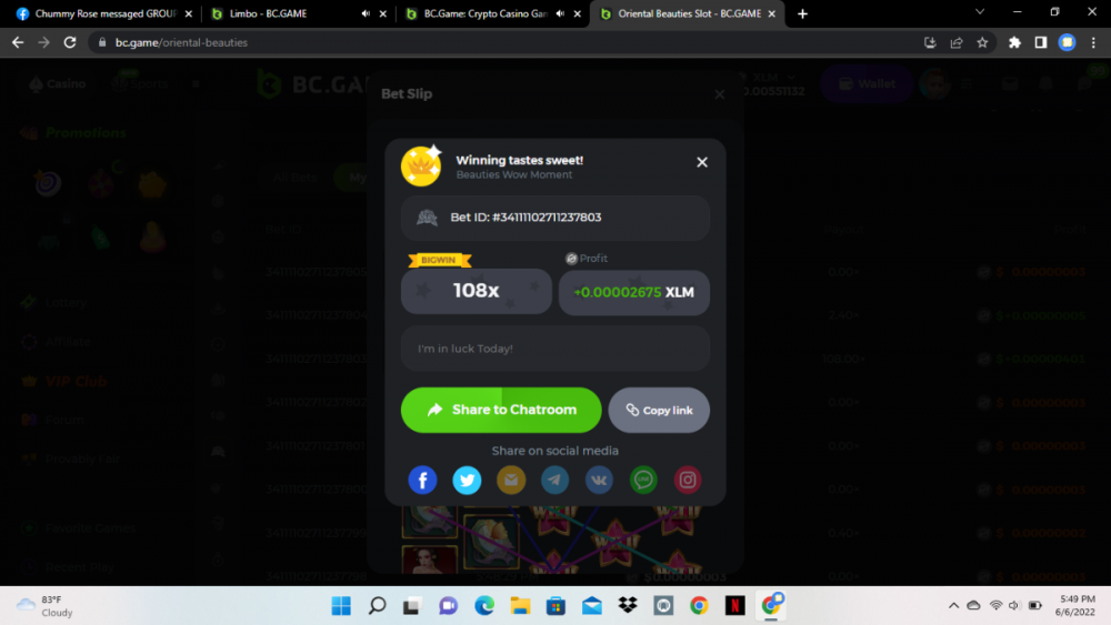 Easy 1. IG username: jy0101012 2.IG post link: https://www.instagram.com/p/CcQ15iihtEh/ IG username: jy0101012 3.Twitter Handle: jy0101012 4.Twitter Link post: https://twitter.com/BCGameOfficial/status/1513818244859457537?s=20&t=k-Gx9ZNEpjCFZIQLuoWYbQ Twitter Handle: jy0101012 5.FB profile link: https://m.facebook.com/john.yan.16121?lst=100042354130320%3A100042354130320%3A1649794589 6. 7. Sports Bet id: 2125322774074499456 8. 9. 10. Enable 2FA Medium 1. 2. 3. 4. 5. Sports Bet id: 2126036089507557603 Hard 1.Wheel 49.5 https://bc.game/sd/?sd=10ILDC7GCTCAOJ