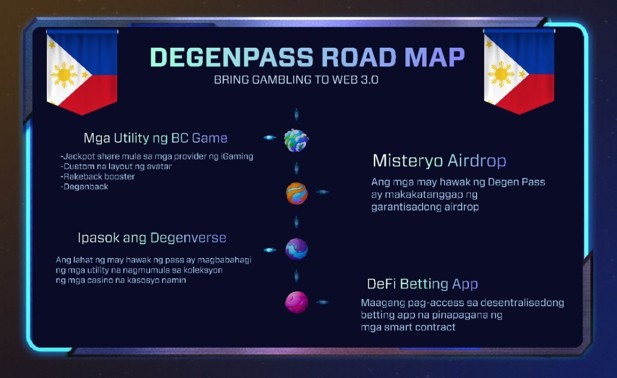 ......DEGEN PASS....... ROADMAP Bring Gambling to WEB 3.0 Mga Utility ng BC Game -Jackpot share mula sa mga provider ng iGaming -Custom na layout ng avatar -Rakeback booster -Degenback Enter Degenverse Ang lahat ng mga may hawak ng pass ay magbabahagi ng mga utility na nagmumula sa koleksyon ng mga casino na kasosyo namin Mystery Airdrop Ang mga may hawak ng Degen Pass ay makakatanggap ng garantisadong airdrop DeFi Betting App Maagang pag-access sa desentralisadong betting app na pinapagana ng mga smart contract