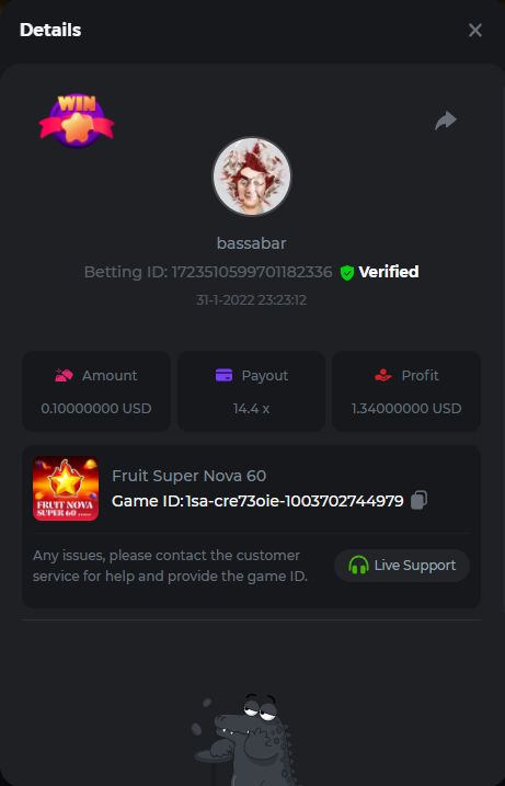 Multiplier: 3965.8928x Betting ID: 37852715010786023 Multiplier: 569.25x (for the bounty) Betting ID: 37852715010784878