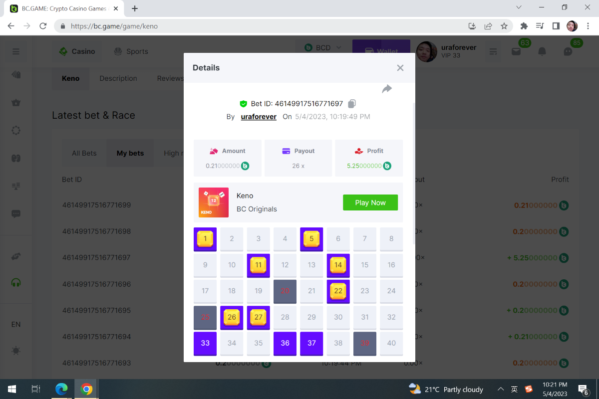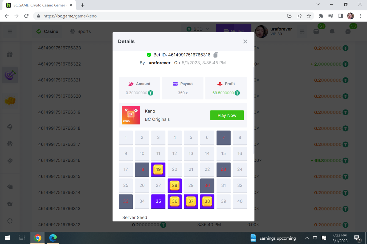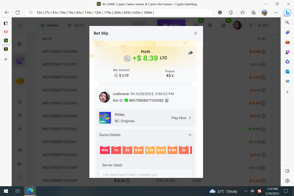 https://bc.game/#/sd/119B2BPPVVJBWZ Bet ID: 96385027536849814 The above is the bet as required. I did not realize you wont able to get link of the bet after 40 hands, thats why I did not have a chance to get the link for my highest winning 71.5X 's link, here is a screenshot of the game record and game ID if that works, If not, plz just use the link on top with the link pasted. Thanks. Cave Of Plunder-Win 96385027536849572 -