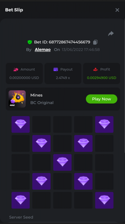 Desafio Semanal - Mines Início: 13 de Junho 18:45 -3 GMT Encerra: 20 de Junho 23:59 -3 GMT "This challenge is only for the people from the Portuguese room" Leia com atenção os termos e condições para que você fique elegível para as recompensas: Qual é o desafio? Os jogadores deverão fazer uma aposta selecionando todos os diamantes abaixo, formando um "X" (Igual ao da imagem). O jogador que conseguir o pagamento mais alto, será o vencedor. Em caso de empate, o jogador com o maior valor base de aposta será o vencedor. Se caso continue empatado, o jogador que tiver feito a APOSTA primeiro vencerá. Qualquer jogada que não esteja exatamente igual a imagem abaixo não será válida. Não selecione nenhum diamante a mais, nenhum a menos. Mas como posso obter pagamentos mais altos? Simples, você pode configurar o mines com mais bombas. Você deve configurar o mines com um mínimo de 2 bombas (Fácil) ou até o máximo de 16 bombas. Os jogadores mais corajosos podem obter pagamentos mais altos se apostando com mais bombas. Vip Mínimo: Não há vip mínimo, qualquer um pode participar. Pagamento Mínimo: O pagamento mínimo é 2.47x Mínimo de aposta: A aposta mínima é o equivalente a 0.002 USD. Moedas elegíveis: Qualquer moeda é elegível desde que cumpra o requisito mínimo de aposta citado acima. Prêmios disponíveis: 1º Lugar: 5 BCD 2º Lugar: 3 BCD 3º Lugar: 2 BCD Como entrar: Para participar, copie o link da aposta que deseja enviar. Depois de copiá-lo, cole-o como resposta a este tópico da seguinte forma: Link: https://bc.game/sd/?sd=10MLCD85OJZB4J Na mesma postagem, faça o upload de uma captura de tela de sua vitória clicando no ID do jogo COM VISUALIZAÇÃO NO modo USD ATIVADO (acessível na parte inferior do menu suspenso da sua carteira na parte superior.) Dessa forma, podemos garantir que sua aposta realmente atendeu ao requisito mínimo no momento da colocação: Por favor, combine todas as suas apostas em um ÚNICO post. Edite sua postagem caso queira colocar outra aposta, não crie uma nova postagem. Uma (1) entrada por família. Qualquer pessoa encontrada com multiconta será desqualificada deste desafio, bem como de todos os desafios futuros. As apostas devem ser feitas durante a janela de tempo especificada acima. Este tópico será bloqueado automaticamente quando o período de tempo terminar. O não cumprimento de quaisquer instruções acima resultará na nulidade do seu envio. Os pagamentos serão feitos dentro de 72 horas após a conclusão do desafio, por favor, seja paciente, prometemos que não esquecemos. Os prêmios serão pagos em BCD.