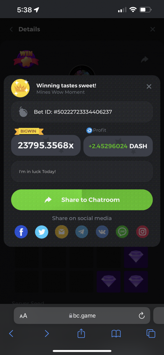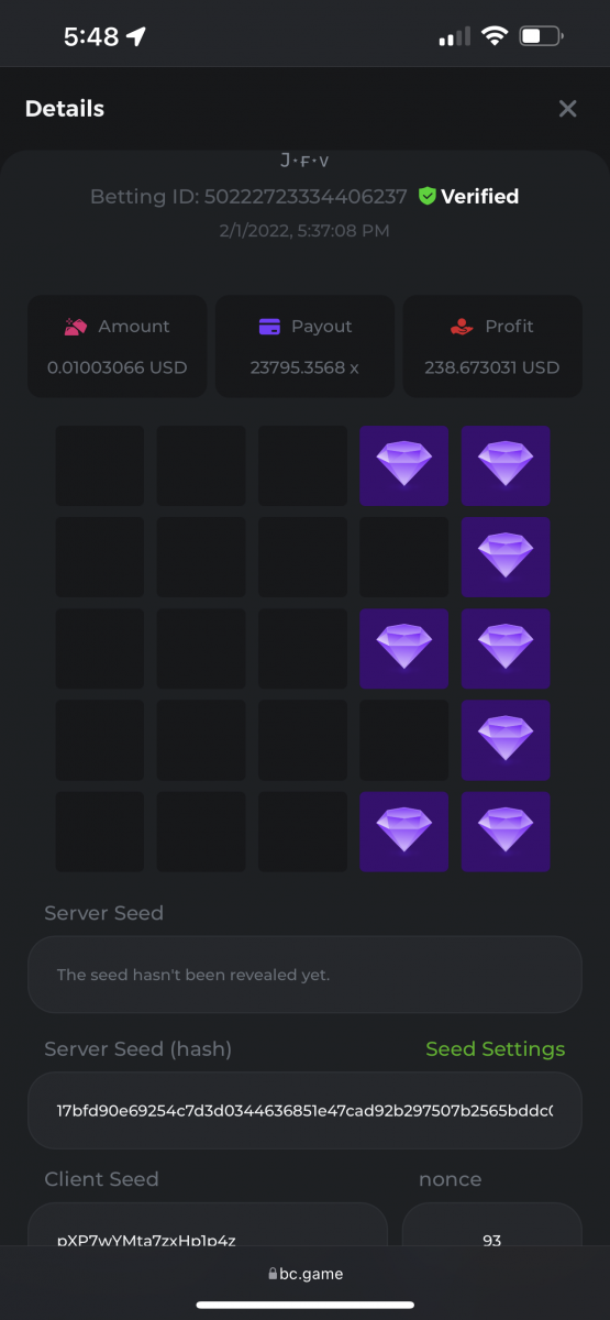 Bet ID: 50222723334406237 I’m certain this won’t qualify but posting anyway in the hopes of an honorable mention. Lol. I’ve been hunting this 15 mine/8 diamond combo for months and finally hit it today.