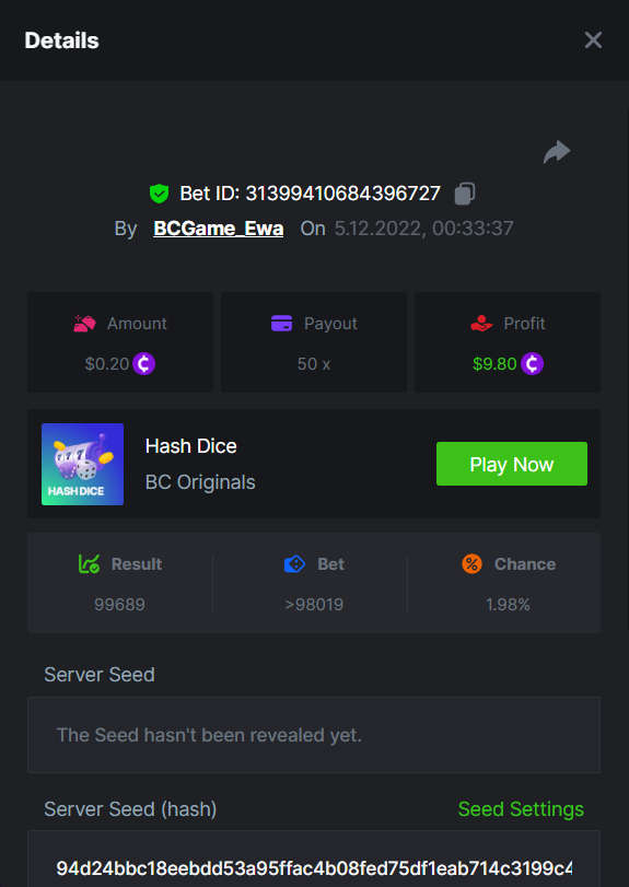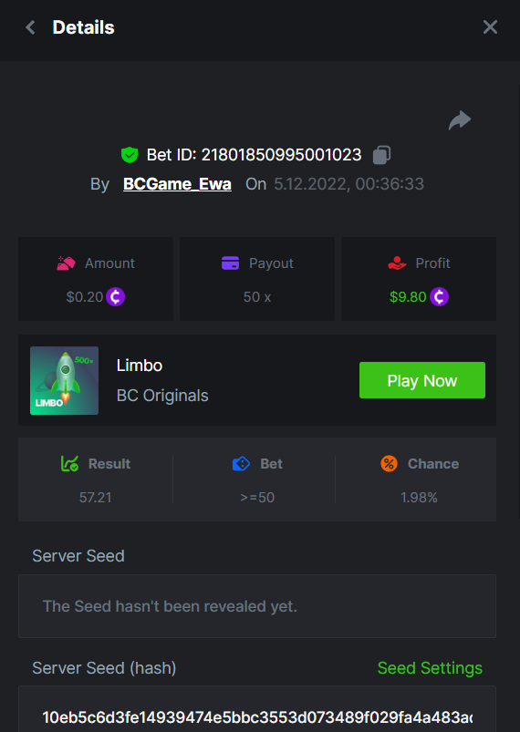 $2,500 Prestige Limbo & Hash Dice Multiplayer Challenge #58 Starts: 05, December 13:30pm GMT Ends: 12, December 13:30pm GMT Hey, hey, VIPs! We are giving away $2,500 in prizes from our Prestige challenge. This time we selected 2 games, they are in-house Limbo and Hash Dice. Play them and win, the Top 10 will take home a major prize, and the remaining $700 will be split between all other players! Thinking that it's over? Calm down, any participant who completes the extra bounty will receive an equal share of 20% of the prize pool. So come join us and see if you can take home the grand prize! (Check out more details below). What's the Challenge? Win the highest multiplier on both In-house games Limbo & Hash Dice. If there is a tie, the player with the higher average bet amount (in USD) shall be the winner. If there is a tie in the amount and payout, the one who posted or edited his post first will be considered in the Ranking. How to Enter To enter, copy the link of the bet you'd like to submit. Once you've copied it, paste it as a reply to this thread like so: Link: https://bc.game/#/sd/10YKS6IE7JSZKJ In the same post, upload a screenshot of your win by clicking the game ID WITH VIEW IN USD mode ENABLED (accessible at the bottom of dropdown menu for your wallet up top. This way, we can ensure that your bet indeed met the minimum requirement at the time of placing it: Link: https://bc.game/#/sd/10YKS6IE7JSZKJ Link: https://bc.game/#/sd/10YKRZ8OLUT7V7 Minimum VIP There's no minimum VIP level Minimum Payouts Hit at least 10x payouts on Limbo and Hash Dice to qualify Minimum Bet Size $0.15 USD equivalent Eligible Coins All cryptocurrencies are eligible (excepting JB) Available Prizes 1st Place....... $500 2nd Place..... $300 3rd Place...... $200 4th Place......$100 5th Place......$50 6th-10th.........$30 All other participants.........$700 Bounty Prize...$500, equal share. EXTRA BOUNTY Share a bet with multiplayer 1000x or higher on Limbo or Hash Dice within the timeframe of this challenge and you will receive a share of 20% of the prize pool! Original rules apply with a minimum bet, minimum payout & VIP. Please combine all of your hits together in a SINGLE post. Edit your existing post for additional hits, don't create a new post. Each eligible entry must have the Bet Slip URL, failure to include it will disqualify participation in the event. Bet Slip image is not mandatory. Bets must be posted within 24 hours of placing bet in order to keep things fair for everyone. Bets must be made during the specified time window stated above. This thread will lock automatically when the time period is over. One (1) entry per household. Anyone found attempting to win multiple prizes will be disqualified from this challenge as well as all future challenges. Failure to follow instructions will result in your submission being null and void. By entering this challenge, you acknowledge that BC.Game has the final decision on results and placement. Payouts will be made within 48 hours of challenge completion, please be patient, we promise you that we haven't forgotten. We check and double check to make sure the rightful winners receive their prize. Prizes will be paid out in BCD. Good luck everyone!