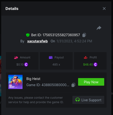 10. Goddess of Egypt 22 x https://bc.game/#/sd/112GSCB3SFJKSZ Big Heist 485 x https://bc.game/#/sd/112J31QB8X91XV