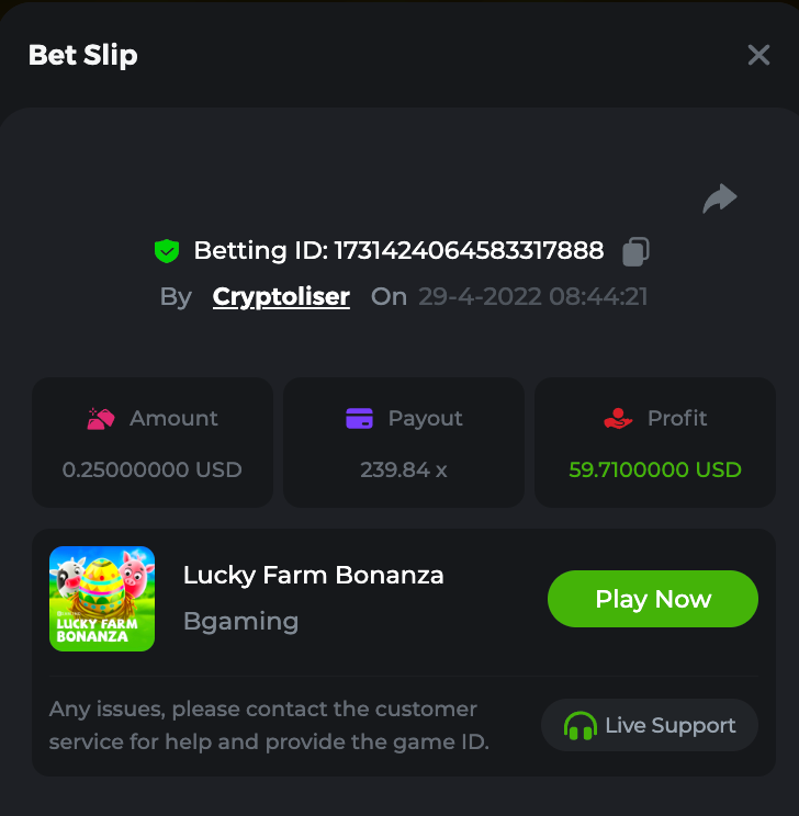 Easy Win a bet in Cave of Plunder on 7.50x payout (Completing all book symbols). https://bc.game/sd/?sd=10IEIG2V5HQVIR Get a minimum 20x multi on Amatic Lady Fruits 100 Easter slot. https://bc.game/sd/?sd=10IKP9TT873V2R Enable 2FA for your BC.Game account (If it's already activated, keep it activated during event week). yep Medium Get a 76x on Plinko. https://bc.game/sd/?sd=10IENDWOWVXY4Z Win a bet by getting a natural Blackjack (A+K/Q/J/10) with only red cards in it. https://bc.game/sd/?sd=10IEPT7FK8F4SZ