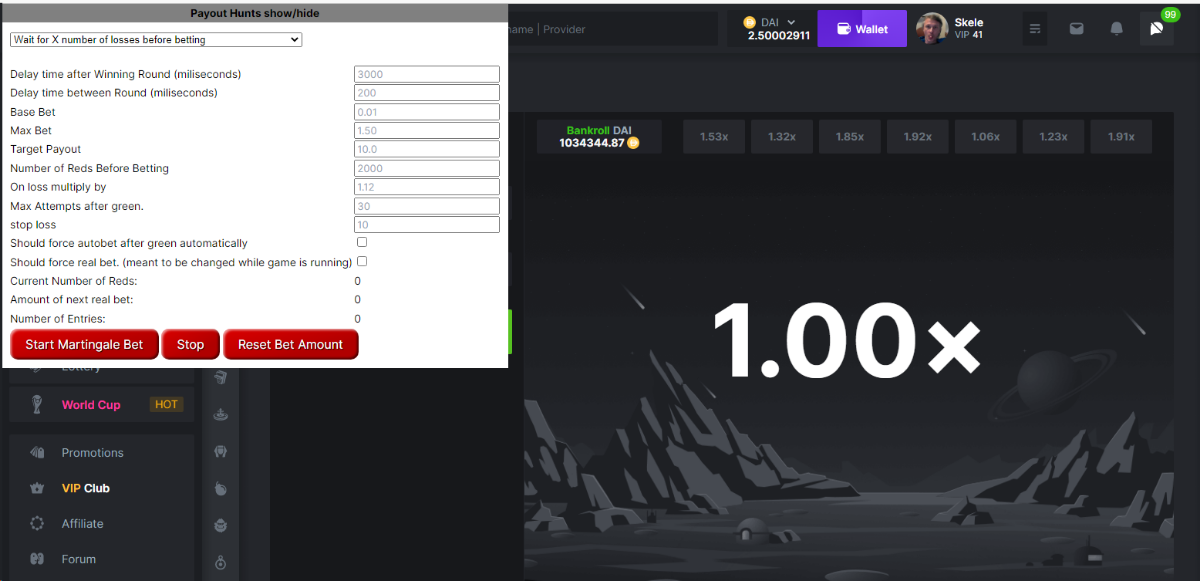 Btxyjyiljwb Posted October 9, 2022 Share Posted October 9, 2022 On 9/24/2022 at 5:24 AM, SineC said: Hi, Just sharing a script i'm working on... to get some feed back? It's a big script(inject javascript F12) to just do a small martingale bet system. But where you just put in the amount you want to lose ^^ and the lose streak max... with the multiplier. And the script will calc the best 'baseBet'. With some lil option to reset seed. var resetActive = 1; var testingMode = 0; var infoToShow = 1; function CDAuto(){ var myCurrentSeed = "0"; getSeed(1).then((resu) => { myCurrentSeed = resu;}); var myNextSeed = "0"; getSeed(2).then((resu) => { myNextSeed = resu;}); var myNextId = "0"; getSeed(3).then((resu) => { myNextId = resu;}); this.stopped = true; this.checkReset = 0; var maxLose = 0; var loseInfo = []; var checkHunAfter = [0]; var checkHunFound = true; var maxPayout = [0]; var logPayout = [ [2,0,0,22], [3,0,0,29], [4,0,0,38], [5,0,0,54], [6,0,0,54], [7,0,0,54], [8,0,0,54], [9,0,0,54], [10,0,0,138], [15,0,0,1005], [20,0,0,1005], [25,0,0,1005], [30,0,0,1005], [50,0,0,1005], [80,0,0,1005], [99,0,0,1005], [120,0,0,1005], [180,0,0,1225] ]; var payoutSelect = [ [2,2.2,22,15], [3,1.6,30,3000], [5,1.25,60,500], [10,1.125,100,750], [120,1.0086,1000,10] ]; //variable semi-setup this.resetSet = (levelRes) => { if(levelRes == 3){ //set with Array of diffrent values?? this.randSel = rand( 0, payoutSelect.lenght, randSel);//A random select from payouts Array this.nextBetSwap = rand( 0,payoutSelect[this.randSel][3]); this.payLoud = payoutSelect[this.randSel][0]; this.multiplier = payoutSelect[this.randSel][1]; this.numLosin = payoutSelect[this.randSel][2]; this.baseBet = getStartBet(originalbalance, this.multiplier, this.numLosin, this.payLoud); } if(levelRes == 2){ this.actResetSeed = true; this.stopped = false; this.tostopped = false; this.betNum = 0; this.loseStop = 0; loseInfo = []; this.resetSeed = parseFloat(document.querySelector('#resetSeed').value); this.stopWin = parseFloat(document.querySelector('#stoppinwin').value); runningbalance = parseFloat(document.querySelector('#betamount').value); originalbalance = runningbalance; this.payLoud = parseFloat(document.querySelector('#payoutR').value); this.multiplier = parseFloat(document.querySelector('#multiplier').value); this.numLosin = parseFloat(document.querySelector('#losingnumb').value); this.baseBet = getStartBet(originalbalance, this.multiplier, this.numLosin, this.payLoud); if(this.baseBet == "low"){ console.log('Sorry bet seems too low...'); this.stop(); } else if(this.baseBet == "multi"){ console.log('Sorry multiplier seems too low'); this.stop(); } } if(levelRes >= 1){ maxLose = -this.baseBet; this.loseCount = 1; this.currentBet = this.baseBet; lbg.payout = this.payLoud; } } //game win or lose option this.resolveBet = (betlog) => { this.betNum += (1); runningbalance += betlog.profitAmount; this.logInfo("numbets","val"); this.servNonce = betlog.nonce; this.gamePayout = (betlog.gameValue/100); if(infoToShow != 1){ checkPayout(this.gamePayout,logPayout);} if(maxPayout[0] <= this.gamePayout){ maxPayout=[this.gamePayout,this.servNonce,this.betNum];} if(this.gamePayout >= 120 && checkHunFound == false){ checkHunAfter.push("\nN: "+checkHunAfter[0]+" Ne: "+this.servNonce+" Val: "+this.gamePayout+" ID: "+myNextId); checkHunFound = true;} if((this.servNonce-10) == this.resetSeed){ getSeed(2).then((resu) => { myNextSeed = resu;}); getSeed(3).then((resu) => { myNextId = resu;}); } // if win if (betlog.winAmount > 0) { if(this.servNonce >= this.resetSeed){ this.actResetSeed = true;} loseInfo.push([this.loseCount,Math.abs(maxLose),this.currentBet,lbg.payout,this.gamePayout]); if(this.tostopped == true){ this.logInfo("bigwins","val"); } else { this.logInfo("wins","val"); } this.resetSet(1); // if lose } else { lbg.payout = this.payLoud; this.currentBet = this.currentBet * this.multiplier; this.loseCount += (1); maxLose += -this.currentBet; if(Math.abs(maxLose) >= originalbalance){ this.logInfo("lose","val"); } } if (this.actResetSeed == true && resetActive == 1) { if(this.servNonce >= 10){ DoSeedChange(myNextSeed, "Limbo", myNextId); getSeed(1).then((resu) => { myCurrentSeed = resu;}); sleep(1000); } else { checkHunAfter[0] += (1); checkHunFound = false; this.actResetSeed = false; getSeed(2).then((resu) => { myNextSeed = resu;}); getSeed(3).then((resu) => { myNextId = resu;}); } } } this.cplay = () => { if(!this.stopped){ lbg.bet(this.currentBet).then(this.resolveBet) .then(() => { this.cplay();}) .catch((errorBet) => { if(errorBet == "Error: Amount invalid"){console.log("WOWOWOW way too lowww");this.stop();} else if(errorBet == "Error: system_error"){console.log("Low option, maybe to low amount or multiplier");this.stop();} else{console.log("Betting ERROR :\n"+errorBet+"\nWill try to continue....");} this.cplay(); }); } } this.start = () => { console.log('Getting BaseBet...'); this.resetSet(2); console.log('Bet starting....'); this.startButton.style.display = 'none'; this.stopButton.style.display = ''; this.stopNext.style.display = ''; if(testingMode == 1){ var vTestInfo = 'Settings Value('+this.multiplier+'x) '+this.payLoud+'('+this.numLosin+'):'+this.baseBet+'\n'; for (let j = 0; j < (payoutSelect.length); j++) { vTestInfo += 'Value for '+payoutSelect[j][0]+':'+getStartBet(originalbalance, payoutSelect[j][1], payoutSelect[j][2], payoutSelect[j][0])+'\n'; } console.log(vTestInfo); this.stop(); } else { setTimeout(this.cplay(),2000); } } this.stop = () => { this.startButton.style.display = ''; this.stopButton.style.display = 'none'; this.stopNext.style.display = 'none'; this.stopped = true; } this.nextstop = () => { this.stopNext.style.display = 'none'; this.tostopped = true } //info print func this.logInfo = (style,val) => { var netNumber = runningbalance - originalbalance; var netPecentage = (netNumber / originalbalance) * 100; if(netPecentage >= this.stopWin){ style="bigwins";} var loseInfo_s = sortByColumn(loseInfo, 0); var sortCount = loseInfo_s