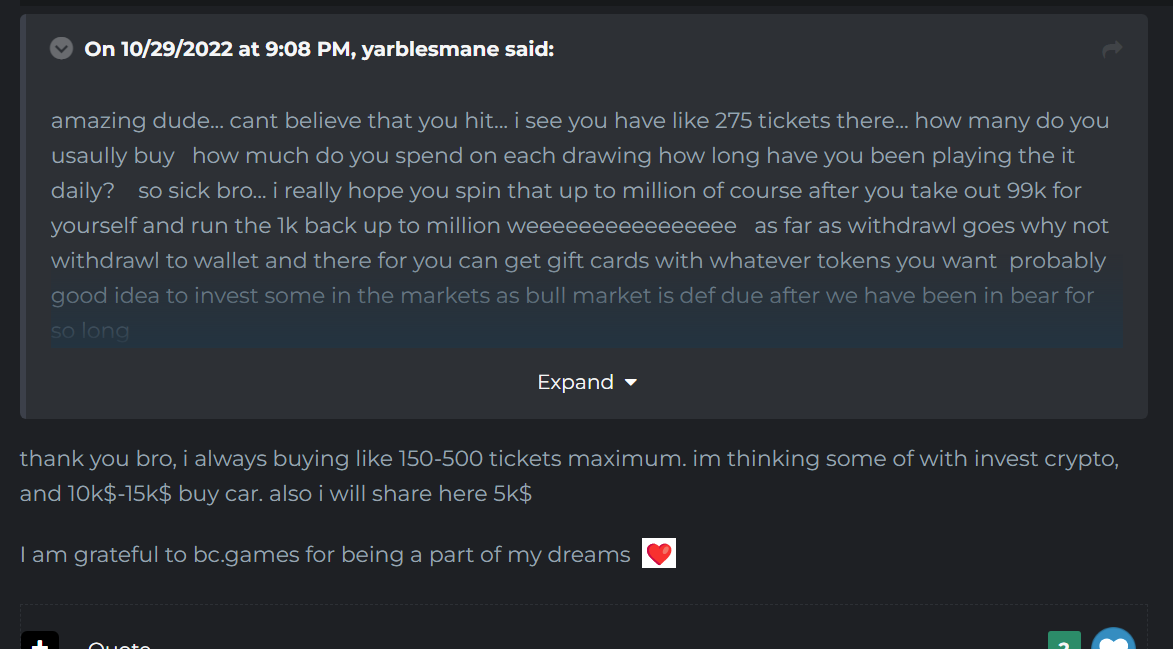i dont think english is his first language...   hehe  even tho most of us with it being our first you couldnt tell from our grammar but i did nothing but support him   contact vip host for him   even coddled him a bit cause he sounded super nervous and anxious over it or maybe it was me having anxiety for him as to me it would be something of a life changing amount only because of a tragic accident i had but besides that when others started to chime in about where is there tips i only stated the obvious that nobody has to tip anybody anything that its his choice and to promise 5k tip was probably something said in the haste of it....    can you imagine you just won 100k and then your account gets locked.... i know id be like sucking air through a straw until i get that lovely confirmation everything is clear      and i was celebrating my birthday with my fiance and mother in law at the time and they saw the thread up on my big screen and kept asking if my friend got his money   so it became the topic of discussion  haha like i want to be all invested in someone else winning... but it carried conversatino over to my purchase of lottery tickets adn asking them to give me numbers to pick