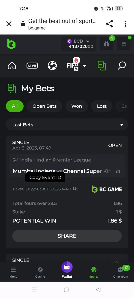Moderator LuCifer_BcGAmE Posted April 12, 2023 Author Moderator Share Posted April 12, 2023 Thanks for taking part of our First IPL forum EVENTWinner List of IPL#1 magicckk (odds=8.20) Reward ; 50 BCD MasterO_O (odds=8.13) Reward : 30 BCD U-day (odds = 7.63) Reward : 20 BCD Ravi Thapa (odds=6.50) Reward : 10 BCD Rakorbakc (6.19) Reward : 05 BCD All winners get you Reward with in 48 hrs Through Forum pm. Link to comment Share on other sites More sharing options...