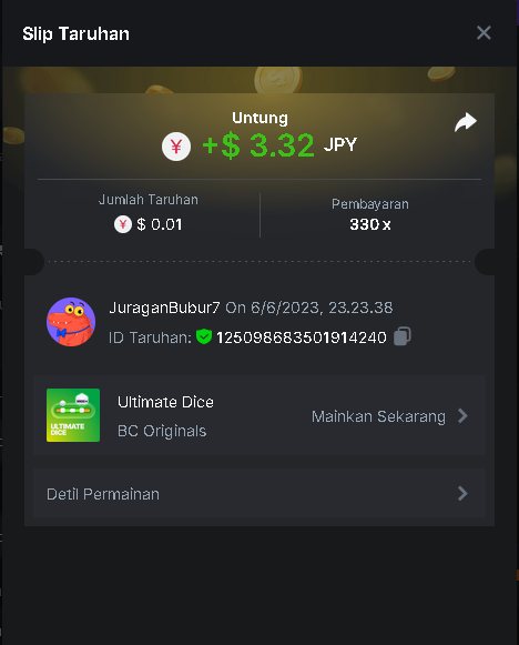 Maksypro Posted June 6, 2023 Share Posted June 6, 2023 Read Carefully Before Start To Hunt Daily Challenges #258 ULTIMATE DICE Hunt : Win the highest multiplier Min Payout requirement 100x Min Level 4 ๏ธDuration Starting : Now End time : 23.59 UTC Time How to Join? Make screenshot + paste your bet link + UID or Profile link Any coin, with min bet 0.01 USD is allowed (jb/bb/bcl not allowed) Reward Prizes 1st Place.....$7 BCD 2nd Place.....$5 BCD 3rd Place.....$4 BCD 4th Place.....$3 BCD 5th Place.....$2 BCD ๐ต Winners will be announcing next day after Roll Point! 1 Link to comment Share on other sites More sharing options...