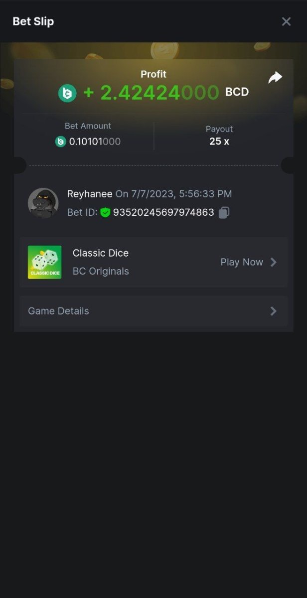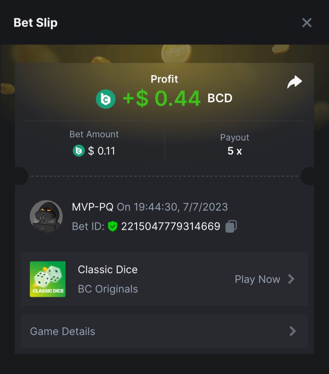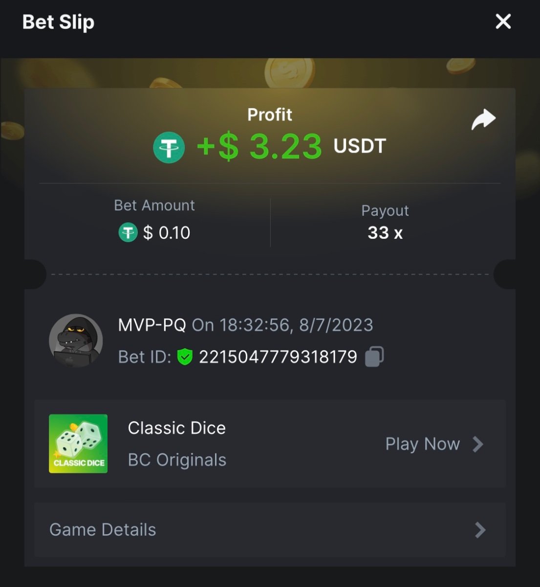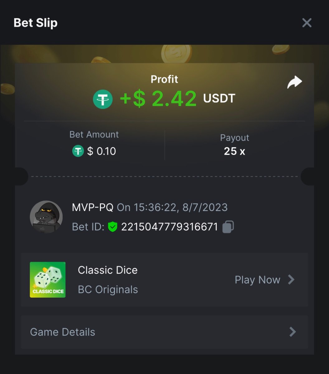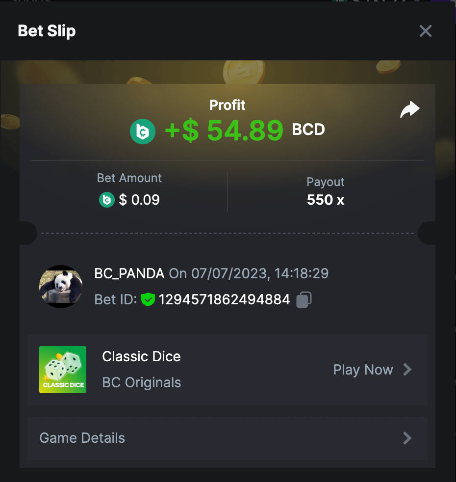 Admin BC_Jack Posted July 7, 2023 Admin Share Posted July 7, 2023 $5k Prestige Classic Dice Challenge #96 DURATION: 7th JULY - 14th JULY 12:30 pm UTC Welcome VIPs! Get ready to seize the moment and embrace the thrill! Brace yourselves for the electrifying Classic Dice challenge! Your mission? Conquer 25 precise target payouts and unite as a formidable force, amassing a colossal 1 point (with a maximum of 16 points)! But that's not all – the prize pool of $5,000 awaits those who dare to take part in this extraordinary and audacious event! Prepare yourselves, for life is a daring adventure, filled with untold possibilities. It's time to cast away doubt and hesitation, and let the dice guide your destiny! Let the games begin! What's the Challenge? Complete as many of the following 25 payouts on our in-house Classic Dice. Must be a winning bet. | 5x | 15x | 25x | 33x | 44x | 55x | 66x | 75x | 90x | 99x | 100x | 150x | 180x | 220x | 300x | 330x | 396x | 450x | 550x | 825x | 900x | 1100x | 2475x | 3300x | 4950x | Each payout you hit above counts as 1 point (Maximum 1 point for each payout). If there is a tie, the player with the higher average bet amount (in USD) shall be the winner. How to Enter To enter, copy the link of the bet you'd like to submit. Once you've copied it, paste it as a reply to this thread like so: Link: https://bc.game/#/sd/11DC5WGXAYR1G3 In the same post, upload a screenshot of your win by clicking the game ID WITH VIEW IN USD mode ENABLED (accessible at the bottom of dropdown menu for your wallet up top. This way, we can ensure that your bet indeed met the minimum requirement at the time of placing it: Link: https://bc.game/#/sd/11DC5WGXAYR1G3 Minimum VIP Minimum VIP 4 with phone verified will be eligible! Eligibility to Win Prize Win at least 4 payouts to qualify. Minimum Bet Size $0.10 USD equivalent Eligible Coins All cryptocurrencies are eligible (excepting JB) Available Prizes GENERAL TERMS Please combine all of your hits together in a SINGLE post. Edit your existing post for additional hits, don't create a new post. Each eligible entry must have the Bet Slip URL, failure to include it will disqualify participation in the event. Bet Slip image is not mandatory. Bets must be posted within 24 hours of placing bet in order to keep things fair for everyone. Bets must be made during the specified time window stated above. This thread will lock automatically when the time period is over. One (1) entry per household. Anyone found attempting to win multiple prizes will be disqualified from this challenge as well as all future challenges. Failure to follow instructions will result in your submission being null and void. By entering this challenge, you acknowledge that BC.Game has the final decision on results and placement. Payouts will be distributed after the event is finished. Please note that it could take anywhere between 24 hours to 7 days after the completion of the event. 3 Link to comment Share on other sites More sharing options...