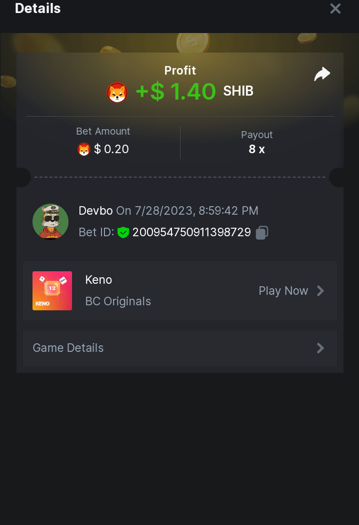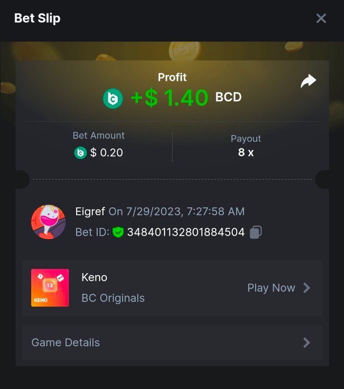 8 x  16.19$   https://bc.game/#/sd/11ESYS9UWXUSFB - Bet ID:346870049975305164