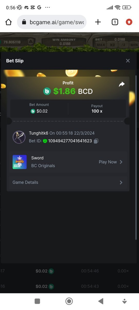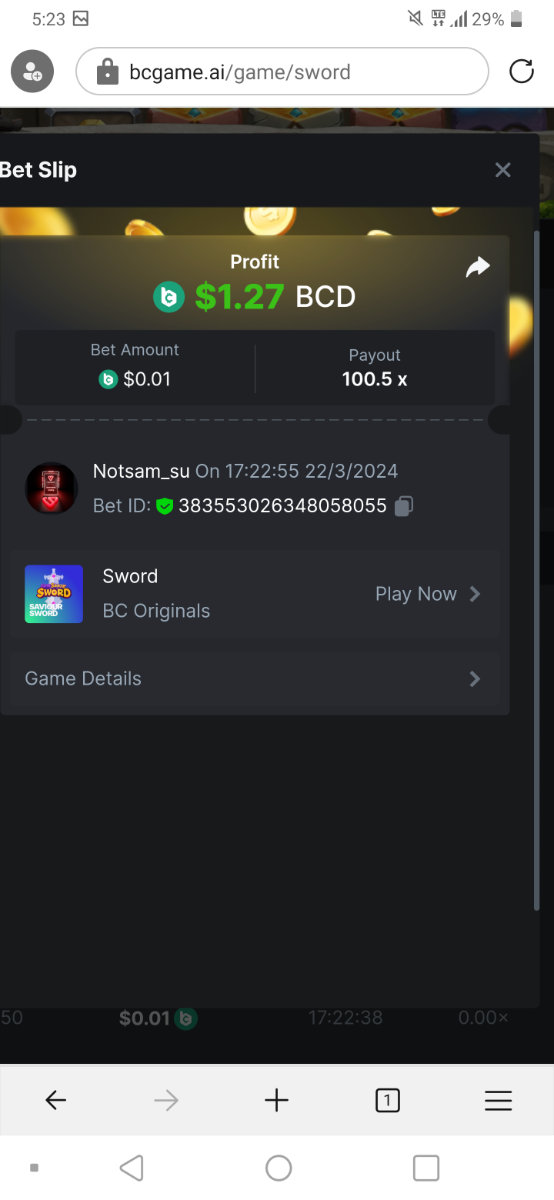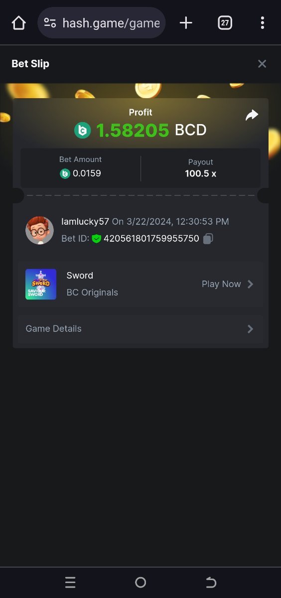Iamlucky57 Posted March 22, 2024 Share Posted March 22, 2024 4 hours ago, Kikikom said: Read Carefully Before Start To Hunt Forum Daily Challenges #547Hunt : Sword Win the highest pay out Min Payout : 20 Min Level 10️Duration Starting : Now End time : 23.59 UTC Time How to Join? Make screenshot + paste your bet link + UID or Profile link Any coin, with min bet 0.01 USD is allowed (jb/bb/bcl not allowed)Reward Prizes 1st Place.....$7 BCD 2nd Place.....$5 BCD 3rd Place.....$4 BCD 4th Place.....$3 BCD 5th Place.....$2 BCD 🏵 Winners will be announcing next day after Roll Point! https://hash.game/#/sd/11V5LYUOGCAZYZ Uid: 5655852 Link to comment Share on other sites More sharing options...