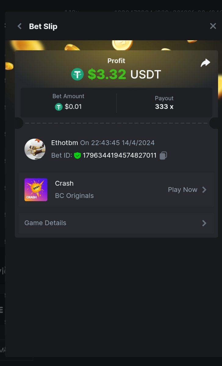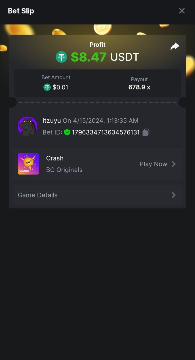 Moderator Giandreas Posted April 14, 2024 Moderator Share Posted April 14, 2024 Read Carefully Before Start To Hunt Forum Daily Challenges #570Hunt : Crash Win the highest pay out Min Payout : 20x Min Level 10 ️Duration Starting : Now End time : 23.59 UTC Time How to Join? Make screenshot + paste your bet link + UID or Profile link Any coin, with min bet 0.01 USD is allowed (jb/bb/bcl not allowed) Reward Prizes 1st Place.....$7 BCD 2nd Place.....$5 BCD 3rd Place.....$4 BCD 4th Place.....$3 BCD 5th Place.....$2 BCD 🏵 Winners will be announcing next day after Roll Point! Link to comment Share on other sites More sharing options...