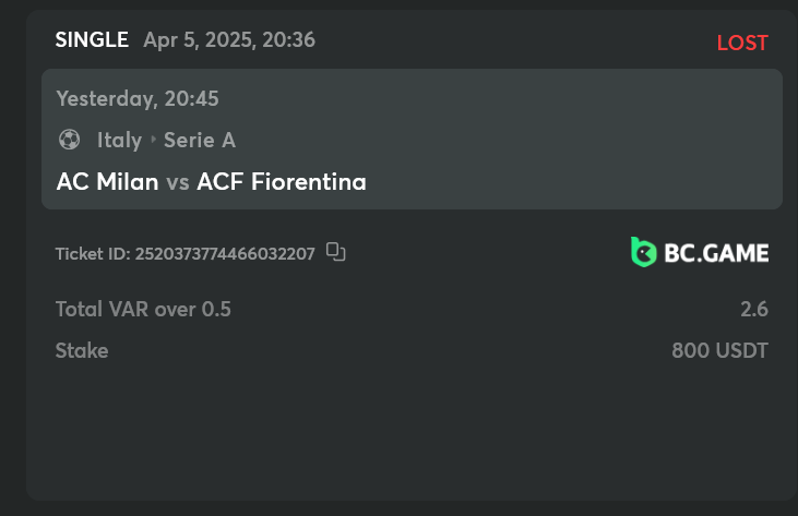 In the Serie A match between AC Milan and Fiorentina on 05.04.2025, I placed a bet on "Total VAR Over 0.5" at odds of 2.6.