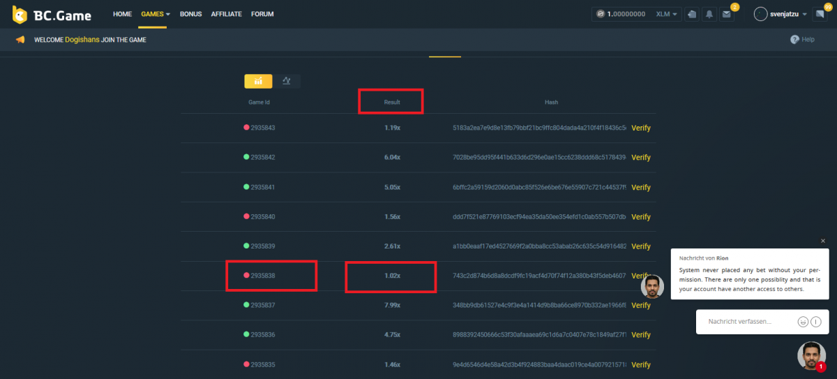 svenjatzu Posted October 11, 2020 Author Share Posted October 11, 2020 now theres a litle fail in this stolen 5 xrp not by me made bet. officially it crashed at 1.02. but have a look here. user: Authentic Carlstrom betid: 16321705 cashoued out this round at 1.96 like 7 other users with betids: 16321702 16321687 16321691 16321701 16321698 and others. so how is it possible that a bet with 5 xrp that i didnt place is crashed at 1.02 while others cashout at the same round at 1.96 ? i wrote to the customer service about this and what he wrote is really aboslutely in no acceptable order. have a loot yourself. you be abled to stop laughing. Link to comment Share on other sites More sharing options...