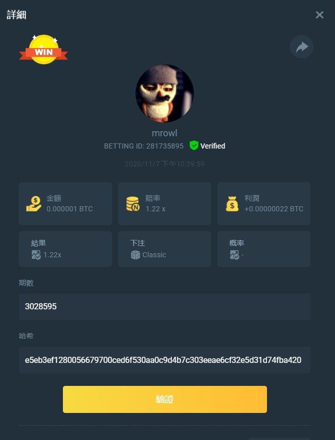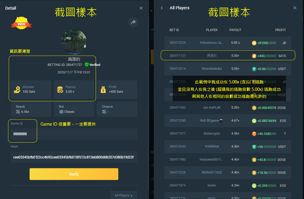 真是的 Posted November 6, 2020 Share Posted November 6, 2020 時間:台北時間 2020/11/7 20:00 ~ 2020/11/8 20:00。 參加資格:玩家需活躍於中文聊天室、並且是大家熟知的中文玩家。(突然冒出來沒人認識的帳號、或長期不參與中文聊天的帳號皆不符資格)。 挑戰遊戲:爆點 (classic)。 最低下注金額:請參考下表,僅限使用表定的幣種、金額不得低於表定的數量。 挑戰目標:下注金額依照上表規定,挑戰成為最後一名成功逃跑的幸運兒 (包含與其它玩家並列最後同時成功逃跑者),並且你的逃跑倍數不得高於 5x (含)。參與挑戰並達成目標者、需在下方回覆此討論串、粘貼螢幕截圖、並提供該局 Game-ID 才算是完成整個任務。 達標獎金:每一次達標得獎金 0.00035 ETH,玩家可以重覆多次挑戰、獎金可累計。 名額:不限名額。此活動總獎金 0.1 ETH、依玩家回覆文章順序統計發放、發完為止。若有剩餘獎金、將留待以後活動使用 獎金發放:將於活動結束後統計並確認資料無誤以後發放獎金。 以上活動訊息如有缺漏將於討論串當中隨時補充更新、請密切關注。 Link to comment Share on other sites More sharing options...