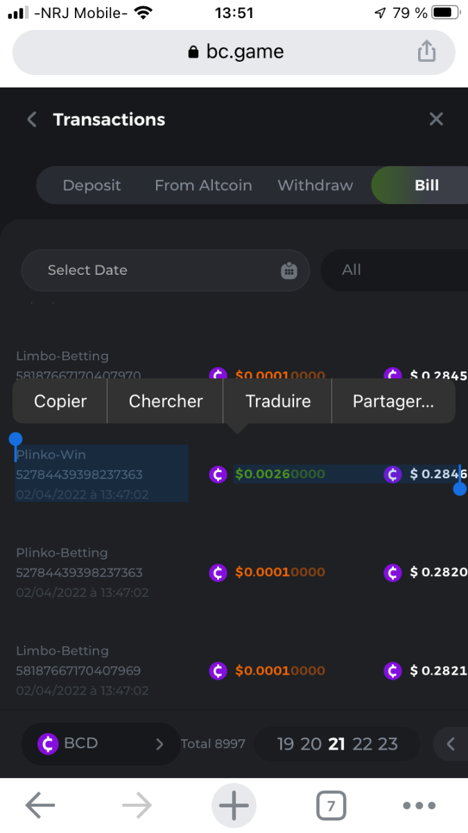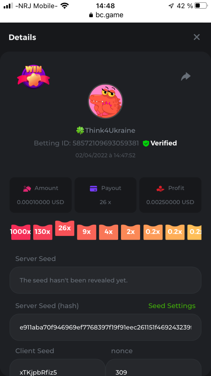 DIANA8800 Posted April 3, 2022 Share Posted April 3, 2022 On 4/2/2022 at 3:16 PM, Aksyen12 said: Bonjour à tous, c'est un challenge pour les joueurs de BC GAME en général. Soyez tous les bienvenus pour participer au concours du week-end !! Le principe est d'avoir le plus de points possible pour chaque joueur! Que le meilleur gagne, Bonne chance !! Hello everyone, this is a challenge for BC GAME players in general. Everyone is welcome to participate in the weekend contest!! The principle is to have as many points as possible for each player! May the best win, Good luck!! Jeux LIMBO et PLINKO : LIMBO : x1000 1point x2000 2points x5000 5points x7000 7points x10000 10pointsPLINKO : x26 1point x130 7points x1000 10points Réglementation : -Post the win link with the photo - Puste pour le week-end/for the weekend -Mise minimum de 0,0001 bcd / Minimum bet of 0.0001 bcd - N'importe quelle pièce autorisé sauf le JB/GB / Any part allowed except JB/GB - Tout niveau autorisé / All levels allowed 10 gagnants / 10 winners. PRIX/PRICE 62 BCD 1. 24 BCD 2. 16 BCD 3. 10 BCD 4 à 10 2 BCD ======= Bonne chance ======== Good luck!! Link to comment Share on other sites More sharing options...