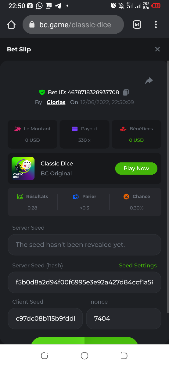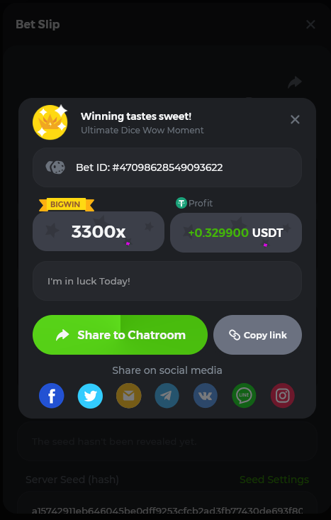 Accédez au jeu pour choisir votre ID de pari, cliquez sur l'icône Partager (↷) puis sur Copier le lien Dans le même message, téléchargez une capture d'écran de votre gain en cliquant sur l'ID du jeu et En mode USD ON